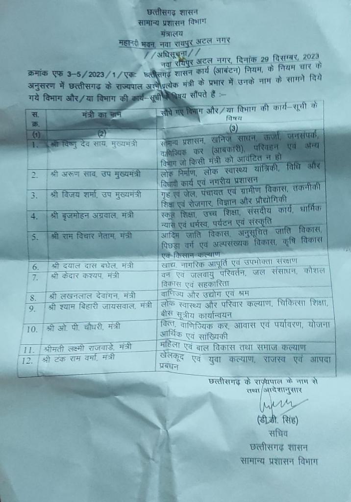 छत्तीसगढ़ में मंत्रियों के विभागों का हुआ बंटवारा, जानें किस मंत्री को मिला कौन सा विभाग…देखें लिस्ट