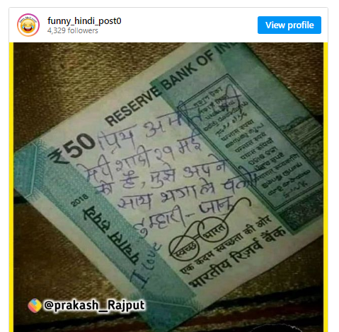 इंस्टाग्राम पर वायरल हो रहे पोस्ट में आपको 50 रुपये का एक नोट नजर आएगा जिस पर कुछ संदेश लिखा हुआ है। आइए आपको बताते हैं कि इस पर क्या लिखा है? 50 रुपये के इस नोट पर लिखा है, ‘प्रिय अमित जी, मेरी शादी 29 मई को है, मुझे अपने साथ भगा ले चलो। तुम्हारी जानु।’ पोस्ट सोशल मीडिया पर काफी तेजी से वायरल हो रहा है।