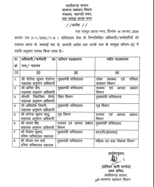 स्वतंत्रता दिवस से पहले बड़ा फेरबदल, सीएम सचिवालय के अधिकारियों का हुआ तबादला, देखें सूची