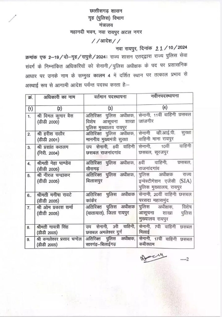 नीरज चंद्राकर अतिरिक्त पुलिस अधीक्षक बिलासपुर से पुलिस अधीक्षक राज्य इन्वेस्टीगेशन एजेंसी एसआईए पुलिस मुख्यालय रायपुर भेजा गया है। मनीषा रावटे अतिरिक्त पुलिस अधीक्षक कांकेर से सेनानी 20वीं वाहिनी छसबल परसदा महासमुंद। ओम प्रकाश शर्मा अतिरिक्त पुलिस अधीक्षक जिला रायपुर से विशेष आसूचना शाखा पुलिस मुख्यालय रायपुर।