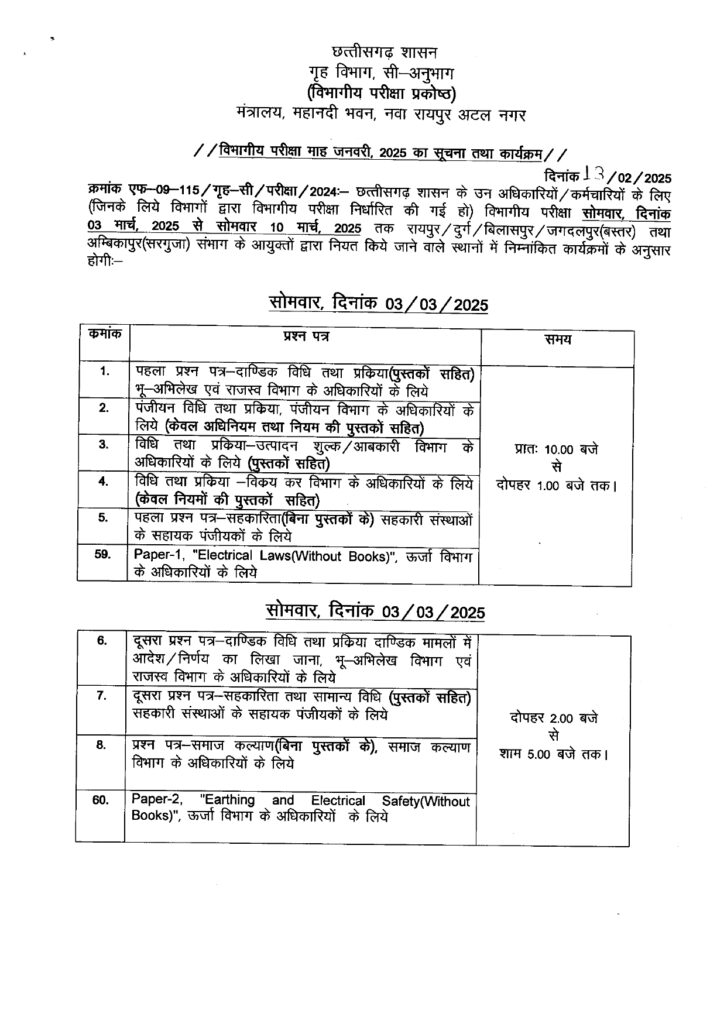 रायपुर। राज्य शासन के गृह विभाग ने जनवरी 2025 की विभागीय परीक्षा का कार्यक्रम जारी कर दिया है। यह परीक्षा उन अधिकारियों और कर्मचारियों के लिए आयोजित की जाएगी, जिनके लिए विभागीय परीक्षा अनिवार्य रूप से निर्धारित है।