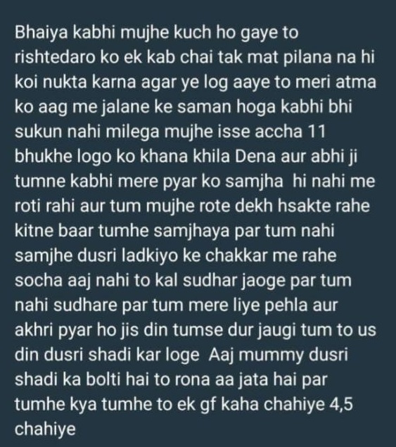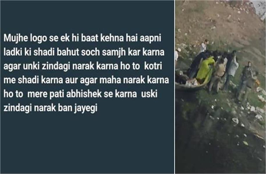 घटना मंगलवार देर रात की है। जहां नवविवाहिता ने भदभदा डैम में छलांग लगाई, जिसके बाद स्थानीय लोगों और पुलिस ने तुरंत रेस्क्यू ऑपरेशन शुरू किया। डूबने से पहले उसे बचा लिया गया और नजदीकी अस्पताल में भर्ती कराया गया। फिलहाल उसकी हालत गंभीर बनी हुई है। वहीं डैम में कूदने से पहले नवविवाहिता ने वॉट्सएप स्टेटस लगाया था, जिसमें पति पर भड़ास निकाली थी। स्टेटस में लिखा- तुम्हें तो एक कहां, 4-5 गर्लफ्रेंड चाहिए। वहीं महिला ने दुनियावालों से निवेदन किया कि अपनी लड़की की शादी सोच समझ कर करना। अगर उनकी जिंदगी नरक करना हो तो ही शादी करना और अगर महानरक करना हो तो मेरे पति अभिषेक से करना।” आगे लिखा, “भैया, कभी मुझे कुछ हो जाए तो रिश्तेदारों को एक कप चाय तक मत पिलाना, न ही कोई न्योता करना, अगर ये लोग आए तो मेरी आत्मा को आग में जलाने के समान होगा, कभी भी सुकून नहीं मिलेगा मुझे, इससे अच्छा 11 भूखे लोगों को खाना खिला देना।”नवविवाहिता ने पति अभिषेक पर अन्य लड़कियों से अफेयर के आरोप लगाए हैं। उसने स्टेटस में लिखा, “अभि जी तुमने कभी मेरे प्यार को समझा ही नहीं, मैं रोती रही और तुम मुझे रोते देख हंसते रहे, कितनी बार तुम्हें समझाया पर तुम नहीं समझे, दूसरी लड़कियों के चक्कर में रहे, सोचा आज नहीं तो कल सुधर जाओगे, पर तुम आखिरी प्यार हो, जिस दिन तुमसे दूर जाऊंगी तुम तो उस दिन दूसरी शादी कर लोगे। आज मम्मी दूसरी शादी का बोलती हैं तो रोना आ जाता है, पर तुम्हें क्या, तुम्हें तो एक गर्लफ्रेंड कहां चाहिए, 4-5 चाहिए।”