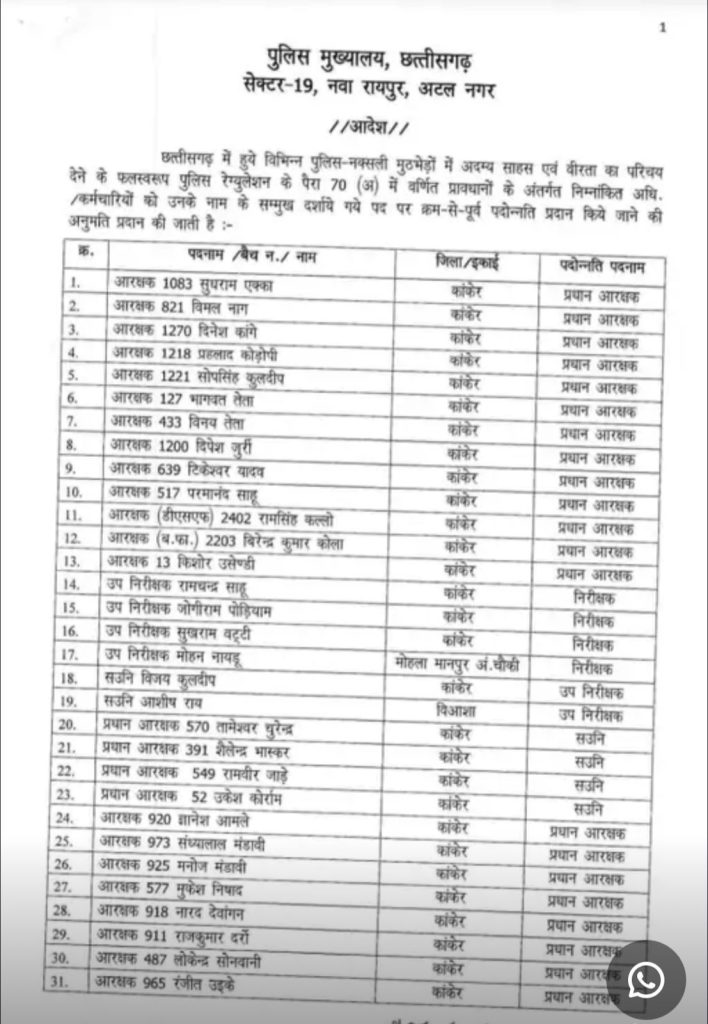 रायपुर. छत्तीसगढ़ में नक्सल मोर्चे पर साहस और वीरता का प्रदर्शन करने वाले पुलिसकर्मियों को आउट ऑफ टर्न प्रमोशन दिया गया है. डीजीपी अरुणदेव गौतम ने 295 पुलिसकर्मियों के प्रमोशन का आदेश जारी किया है. जारी आदेश में कांकेर, नारायणपुर, बस्तर, दंतेवाड़ा, बीजापुर और एसटीएफ के जवान शामिल हैं. जिन पुलिसकर्मियों को पदोन्नति मिली है, उनमें आरक्षक, प्रधान आरक्षक, सहायक उप निरीक्षक (ASI) और उप निरीक्षक (SI) रैंक के अधिकारी-कर्मचारी शामिल हैं.