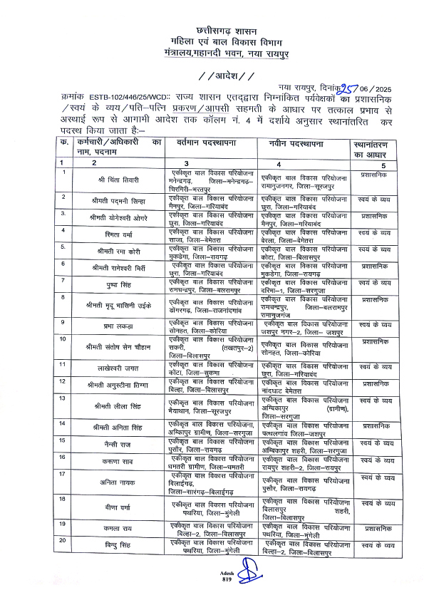 रायपुर. राज्य सरकार ने महिला एवं बाल विकास विभाग में बड़े पैमाने पर अधिकारियों का तबादला किया है. कई जिलों के परियोजना अधिकारियों को इधर से उधर किया गया है.