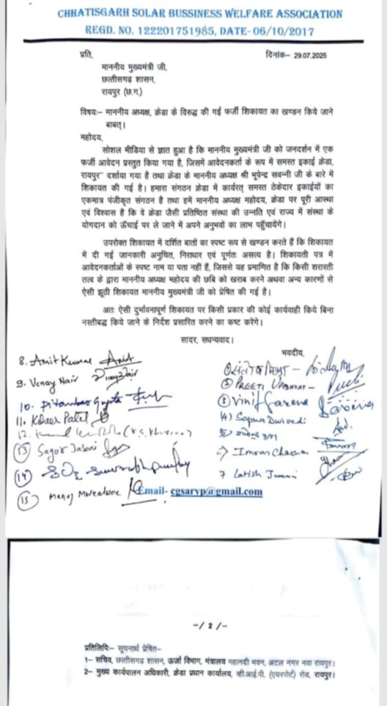 रायपुर. छत्तीसगढ़ सोलर बिजनेस वेलफेयर एसोसिएशन ने मुख्यमंत्री विष्णुदेव साय को एक पत्र लिखकर उस शिकायती पत्र का खंडन किया है, जिसमें क्रेडा अध्यक्ष भूपेंद्र सवन्नी पर तीन फीसदी कमीशन लेने का आरोप लगाया गया था. एसोसिएशन ने शिकायत पत्र को फर्जी बताते हुए बेबुनियाद करार दिया है. पत्र में बताया गया कि जनदर्शन में दी गई शिकायत गुमनाम, बिना किसी प्रमाण और मनगढ़ंत तथ्यों पर आधारित है. न तो स्पष्ट नाम है, न ही पता या संपर्क जानकारी. यह कृत्य किसी शरारती तत्व ने सुनियोजित तरीके से किया है. क्रेडा से जुड़े सभी ठेकेदारों का यह एकमात्र पंजीकृत संगठन है.