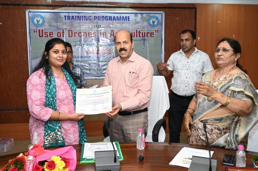 कार्यक्रम के समापन में डॉ. गिरीश चंदेल, इंदिरा गांधी कृषि विश्वविद्यालय रायपुर द्वारा प्रतिभागियों को प्रमाणपत्र वितरित किये गए। डॉ. चंदेल ने आधुनिक कृषि में ड्रोन के प्रभावी उपयोग और इसके माध्यम से फसलों की निगरानी पर अपने विचार व्यक्त किये। उन्होंने प्रतिभागियों से प्रशिक्षण कार्यक्रम का फीडबैक भी लिया। डॉ. चंदेल ने कहा कि अब ये सारे प्रतिभागी हमारे अन्य विद्यार्थियों को भी इस क्षेत्र में व्यवसाय की संभावनाएं तलाशने हेतु जागरूक करेंगे। कार्यक्रम के समापन अवसर पर डॉ. संजय शर्मा अधिष्ठाता छात्र कल्याण, डॉ. आरती गुहे अधिष्ठाता कृषि महाविद्यालय रायपुर, डॉ. विनय पांडेय अधिष्ठाता कृषि अभियांत्रिकी महाविद्यालय रायपुर, डॉ. एस.एस. टूटेजा निदेशक विस्तार सेवाएं, महाविद्यालय के विभिन्न विभागाध्यक्ष, प्लेसमेंट सेल के अधिकारी एवं छात्र छात्राएं उपस्थित थे। संपूर्ण प्रशिक्षण ट्रेनर श्री सुभाशीष पटनायक, द्वारा दिया गया। कार्यक्रम का संचालन डॉ. नीतीश तिवारी, डॉ. रामा मोहन सावू एवं डॉ. शुभा बैनर्जी ने किया।