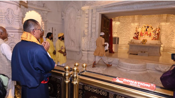 भूटान के पीएम सुबह 10:00 बजे राम मंदिर पहुंचे। करीब एक घंटे 40 मिनट के राम मंदिर प्रवास में उन्होंने रामलला और राम दरबार के दर्शन किए। इसके साथ ही कुबेर टीला, जटायु और सप्त मंडपम के मंदिरों में भी दर्शन पूजन किया। उन्होंने लोअर प्लिंथ के चारों ओर लगने वाले म्यूरल के साथ परकोटा की दीवार पर लगने वाले ब्रांज के म्यूरल को भी निहारा।