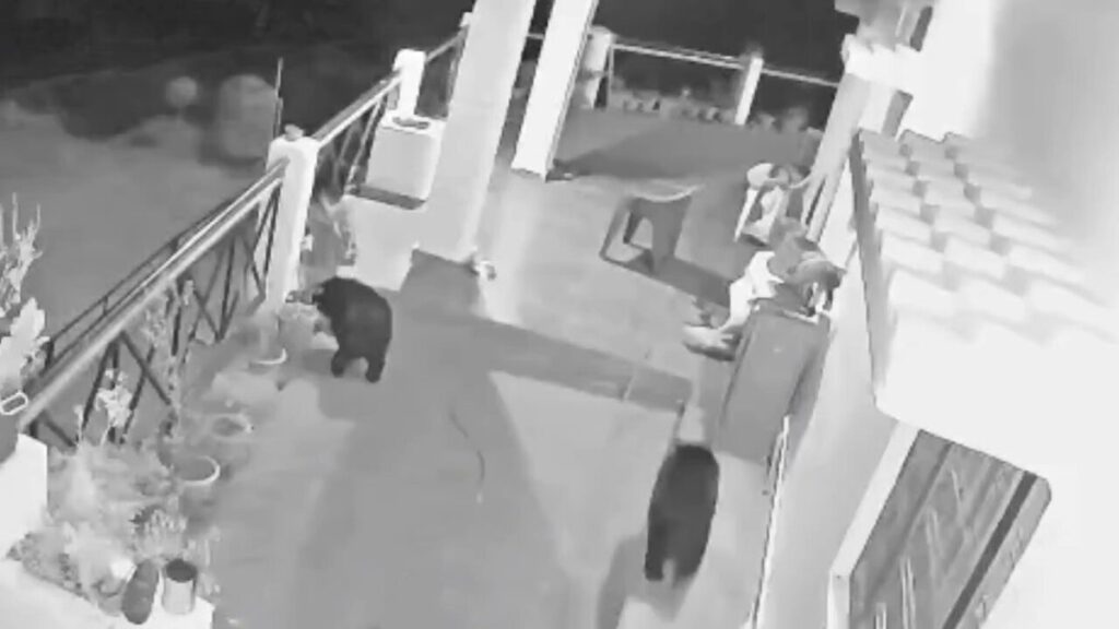 उत्तराखंड – भालुओं के आतंक से लोगों में भय का माहौल है। उत्तराखंड के उत्तरकाशी जिले के टकनौर क्षेत्र के मल्ला गांव सहित कई गांवों में भालू घरों की छतों और आंगन में बेखौफ घूम रहे हैं। इस कारण लोग अंधेरा होने के बाद घरों से बाहर नहीं निकल पा रहे हैं। गुरुवार रात एक घटना भटवाड़ी ब्लॉक के मल्ला गांव में देखने को मिली है। यहां एक भालू और उसके दो बच्चे घर में घुस आए और भोजन की तलाश में आंगन में घूमते रहे। यहां तक की भालुओं की गैंग ने इस घर के दरवाजे पर भी कई बार दस्तक दी। इससे घर के भीतर मौजूद लोगों में हड़कंप मच गया। भालू काफी देर तक इस घर के आंगन में घूमते रहे। अगली सुबह सीसीटीवी फुटेज देख गांव वालों की रूह कांप उठी। लोगों ने बताया कि गांवों में पिछले कई दिनों से भालुओं ने आतंक मचा रखा है।गुरुवार रात भी भटवाड़ी के मल्ला गांव में जंगल से निकलकर एक भालू अपने दो बच्चों के साथ घर में घुस गया था। भालुओं के घर में घुसने की घटना वहां लगे सीसीटीवी कैमरे में कैद हो गई। भालू ने अपने बच्चों के साथ घर में प्रवेश किया और वहां भोजन ढूंढने लगे। इस दौरान भालू के दोनों बच्चे लड़ते भी दिखाई दे रहे हैं।