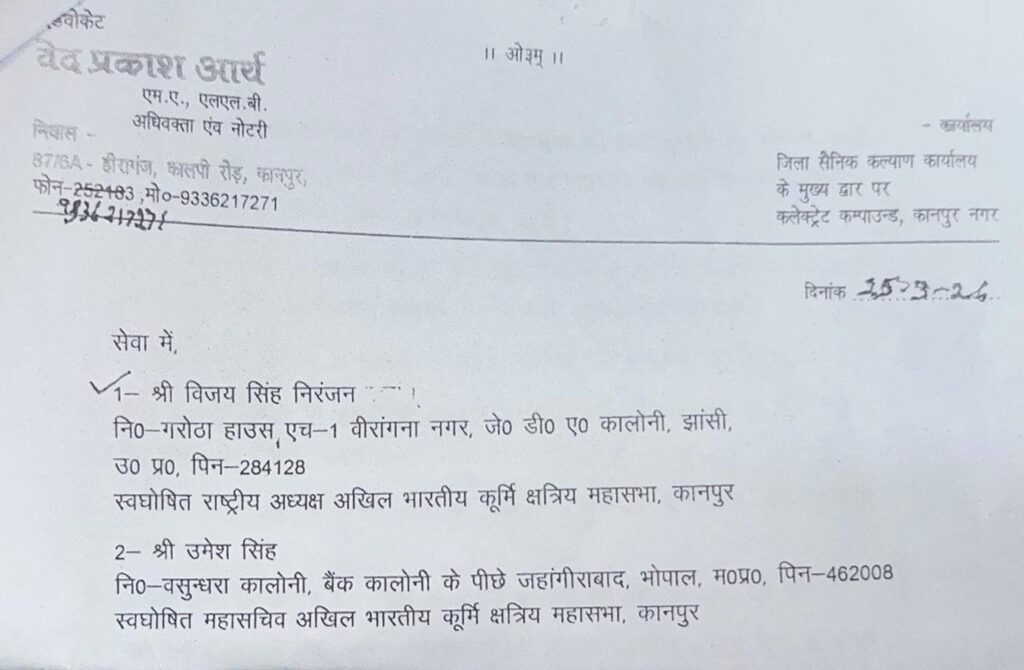 रायपुर, अखिल भारतीय कूर्मी क्षत्रिय महासभा के पंजीकृत पदाधिकारियों द्वारा बार-बार आपत्ति लिए जाने और चेतावनी देने के बाद भी विजय बघेल अपनी हरकतों से बाज नहीं आ रहे हैं। वर्तमान में वे इसी बेनर का उपयोग करते हुए जबलपुर में 4 एवं 5 अप्रैल को अखिल भारतीय कुर्मी क्षत्रिय महासभा राष्ट्रीय महिला सम्मेलन का आयोजन किया जा रहा है। जो पूरी तरह से असंवैधानिक एवं फर्जी है। इस फर्जी आयोजन को ध्यान में रखते हुए अखिल भारतीय कुर्मी क्षत्रिय महासभा के राष्ट्रीय अध्यक्ष सर्वेश कटियार ने स्वघोषित राष्ट्रीय अध्यक्ष विजय सिंह निरंजन एवं महासचिव उमेश सिंह को नोटिस जारी किया है। नोटिस में यह भी कहा गया है कि क्यों नहीं आप लोगों के खिलाफ कानूनी कार्रवाई की जाए। जारी नोटिस में राष्ट्रीय अध्यक्ष सर्वेश कटियार ने कहा कि यह कि आप स्वयं को अखिल भारतीय कुर्मी क्षत्रिय महासभा रजिस्ट्रेशन संख्या -220/84-85 का राष्ट्रीय अध्यक्ष बताकर समाज में भ्रम एवं भ्रंति उत्पन्न कर रहे हैं। जब की आपके पास इस पद का कोई वैधानिक अधिकार नहीं हैं।