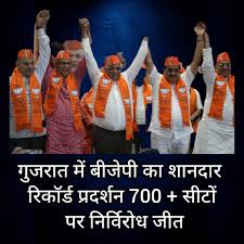 गुजरात स्थानीय निकाय चुनावों में बीजेपी ने रिकॉर्ड तोड़ प्रदर्शन किया है और बड़ी जीत हासिल कर ली है। कई सीटों पर हुए विवाद के बीच भाजपा ने 700 से अधिक सीटों पर निर्विरोध जीत हासिल की है, जो 2021 के चुनाव में मिली 220 सीटों की तुलना में बहुत अधिक है। विपक्षी पार्टी कांग्रेस और आम आदमी पार्टी (AAP) ने बीजेपी और पुलिस पर उम्मीदवारों को डराने-धमकाने और फॉर्म वापस लेने के लिए मजबूर करने के आरोप लगाए हैं, जिसके कारण उन्हें अपने उम्मीदवार अज्ञात स्थानों पर छिपाने पड़े।