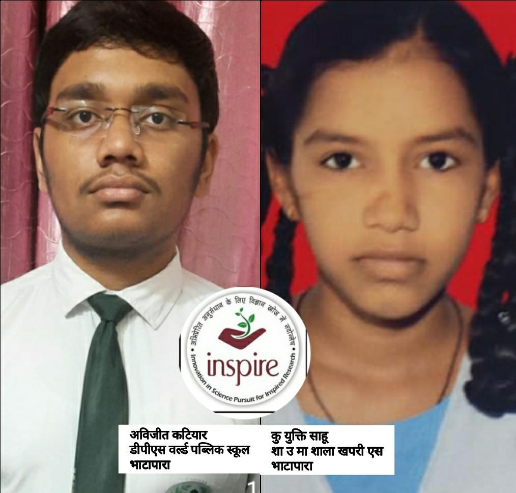 राजीव वर्मा व प्रतीक साहू आधारशिला पब्लिक हा. सेके. शाला से है।खपरी एस की स्टूडेंट युक्ति साहू ने भूकंप के दौरान संकेतकों के माध्यम से सुरक्षा उपायों के संबंध में अपना मॉडल तैयार किया है।प्रतीक साहू ने स्ट्रीट लाइट प्यूरीफायर के संबंध में एवं राजीव वर्मा ने टक्कर रोधी डिवाइडर के सम्बन्ध् जबकि अभिजीत कटारिया नेसिक्योर यूएसबी पोर्ट के संबंध में प्रोजेक्ट तैयार किया है, ज्ञातव्य हो कि भारत सरकार के द्वारा स्कूलो के कक्षा 6 -10 के प्रतिभावान बच्चो के लिए प्रोद्ययोगिकी और विज्ञान विभाग द्वारा जिले और राज्यो से बच्चो का चयन किया जाता है।ऐसे बच्चे जो संस्कृति से जुड़े हो जिनकी सोच और समाज प्रेरणादायकहो,जिनकी अनोखी रचनात्मक शैली हो.बच्चों को सक्षम बनाने के लिये, उनमें विज्ञान व नवो-न्मेषी गुणों को बढ़ावा देने के लिय इस योजना को प्रस्तावित किया गया। भाटापारा में डीपीएस वर्ल्ड की प्राचार्य ऋतु रजनीश,आधारशिला से श्री एन पी भास्कर व खपरी एस प्राचार्य श्री साहू ने राज्य स्तर पर बच्चो के चयन पर हर्ष व्यक्त हुए शुभकामनाएं दी।उक्त जानकारी मीडिया प्रकोष्ठ प्रभारी श्री ईश्वर देवदास ने दी।