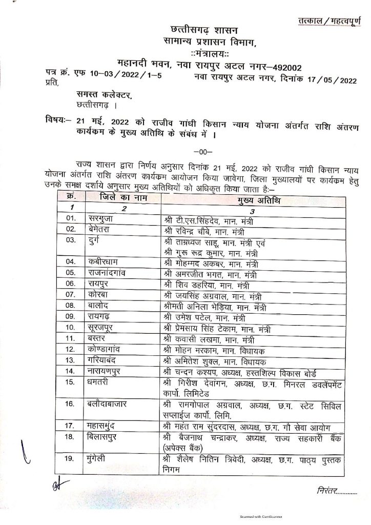 राजीव गांधी किसान न्याय योजना अंतर्गत राशि अंतरण कार्यक्रम के लिए मुख्य अतिथियों की सूची जारी
