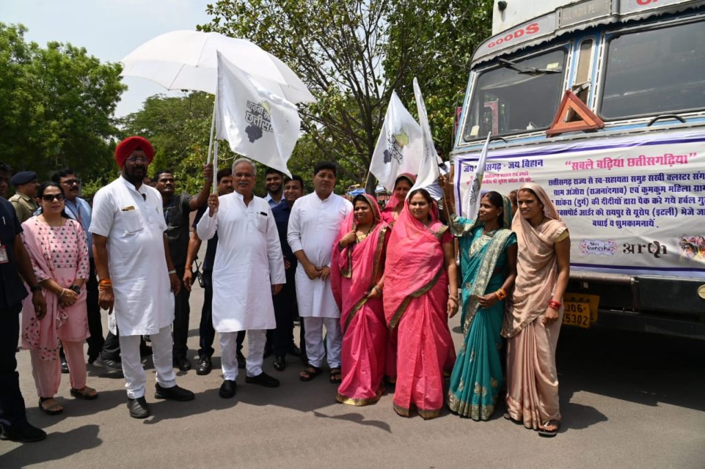 मुख्यमंत्री भूपेश बघेल आज रायपुर स्थित अपने निवास कार्यालय में आयोजित कार्यक्रम में छत्तीसगढ़ राज्य में तैयार हर्बल गुलाल से भरे ट्रक को यूरोप एक्सपोर्ट करने के लिए झंडी दिखाकर रवाना किया। यह हर्बल गुलाल स्व-सहायता समूह के सखी क्लस्टर संगठन अंजोरा राजनांदगांव एवं कुमकुम महिला ग्राम संगठन सांकरा दुर्ग की महिलाओं ने श्री गणेशा ग्लोबल गुलाल प्राइवेट लिमिटेड के मार्गदर्शन में अपनी लगन और मेहनत से तैयार किया है। यूरोप एक्सपोर्ट किए जा रहे 23 हजार 279 किलो हर्बल गुलाल का मूल्य 41 लाख 95 हजार 302 रूपए है। छत्तीसगढ़ के हर्बल गुलाल से भरे ट्रक को यूरोप रवाना करने झंडी दिखाने के मौके पर मुख्यमंत्री के सलाहकार प्रदीप शर्मा, विधायक व छत्तीसगढ़ गृह निर्माण मंडल के अध्यक्ष कुलदीप जुनेजा एवं नगर निगम रायपुर के महापौर एजाज ढेबर, श्री गणेशा ग्लोबल गुलाल प्राइवेट लिमिटेड के डायरेक्टर श्री अनुज गोयल एवं महिला स्व-सहायता समूह के पदाधिकारीगण मौजूद थे।