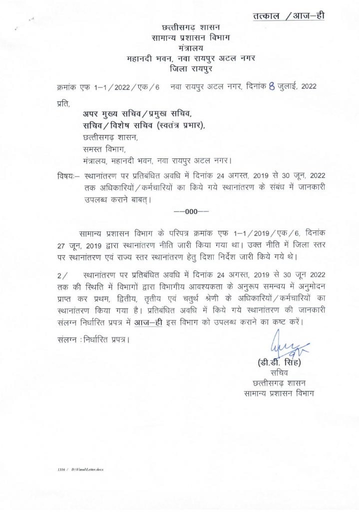 रायपुर। स्थानांतरण पर प्रतिबंधित अवधि में अधिकारियों-कर्मचारियों का किये गये स्थानांतरण के संबंध में जानकारी उपलब्ध कराने कहा गया है। इस संबंध में विभागीय पत्र लिखा गया है।