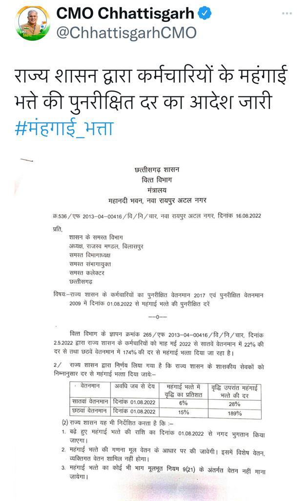 रायपुर। राज्य शासन द्वारा कर्मचारियों के महंगाई भत्ते की पुनरीक्षित दर का आदेश जारी किया गया है। देखे आदेश