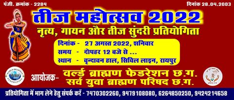 वर्ल्ड ब्राह्मण फेडरेशन छ.ग. एवं सर्व युवा ब्राह्मण परिषद छ.ग. द्वारा विगत वर्षों की भाँति इस वर्ष भी प्रदेश की विप्र महिलाओं/युवतियों को पूर्णतः पारिवारिक, सामाजिक माहौल में मंच प्रदान करने “तीज महौत्सव” में नृत्य, गायन और तीज सुंदरी प्रतियोगिता दिनांक – 27 अगस्त, 2022 शनिवार, समय – दोपहर 12 बजे से, स्थान – वृन्दावन हाल, सिविल लाइन, रायपुर में आयोजित किया जा रहा है. प्रत्येक वर्ग की प्रतियोगिता के विजेता व उपविजेता को स्मृति चिन्ह से सम्मानित किया जाएगा एवं भाग लेने वाले प्रत्येक प्रतिभागी को प्रमाण पत्र प्रदान किया जाएगा । प्रतियोगिता हेतु 25 अगस्त, 2022 तक प्रविष्टियाँ आमंत्रित हैं । जो भी विप्र महिला/युवती ग्रुप इस तीज महोत्सव में सहभागिता करना चाहते हैं वो कार्यक्रम के सम्बंध में जानकारी या भाग लेने हेतु निम्न मोबाइल नम्बर पर सम्पर्क कर सकते हैं- सम्पर्क सूत्र 1.महिला अध्यक्ष नमिता शर्मा 7470302260 2. महासचिव सुमन मिश्रा 9479108080 3. सांस्कृतिक सचिव प्रीति मिश्रा 6264850250 4. प्रदेश अध्यक्ष, अरविन्द ओझा 9424214658