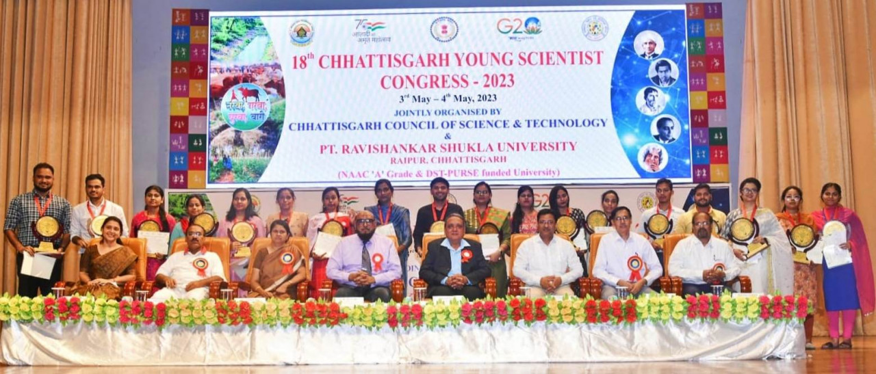 रायपुर. छत्तीसगढ विज्ञान एवं प्रौद्योगिकी परिषद तथा पं. रविशंकर शुक्ल विश्वविद्यालय के संयुक्त तत्वावधान में पंडित दीनदयाल उपाध्याय प्रेक्षागृह में दो दिवसीय 18 वें  युवा वैज्ञानिक सम्मेलन का 04 मई को समापन हुआ। इस समारोह में 19 चिन्हित विषयों में युवा वैज्ञानिकों को यंग साइंटिस्ट अवॉर्ड- 2023 प्रदान किया गया। इसके साथ ही इन युवा वैज्ञानिकों को 21 हजार रूपए पुरस्कार राशि, मेडल तथा प्रमाण पत्र देकर सम्मानित किया गया। साइंटिस्ट अवॉर्ड से सम्मानित युवा वैज्ञानिक को किसी राष्ट्रीय प्रयोगशाला, राष्ट्रीय अनुसंधान केंद्र और विश्वविद्यालय में शोध कार्य के लिए अवसर प्रदान किया जाएगा। समापन समारोह के मुख्य अतिथि राष्ट्रीय शैक्षणिक समिति, एनसीएससी, विज्ञान एवं प्रौद्योगिकी विभाग, भारत सरकार डॉ. ललित शर्मा एवं कार्यक्रम की अध्यक्षता कर रहे पं. रविशंकर शुक्ल विश्वविद्यालय के कुलपति डॉ. सच्चिदानंद शुक्ल सहित छŸाीसगढ़ विज्ञान एवं प्रौद्योगिकी परिषद के महानिदेशक डॉ. एस कर्माकर सहित वहां मौजूद समस्त वैज्ञानिकों एवं अधिकारियों ने इन युवा वैज्ञानिकों को बधाई दी और उनके उज्जवल भविष्य की कामना की।