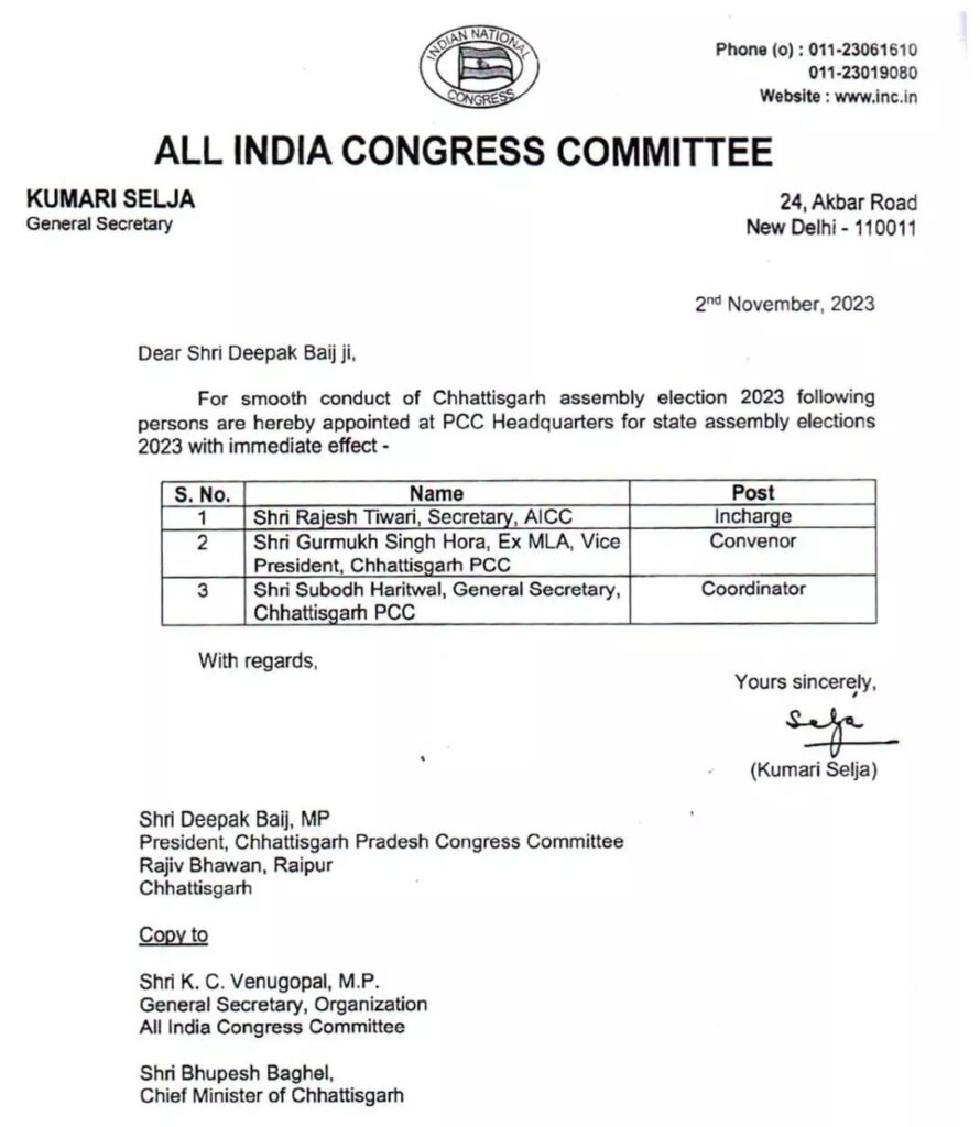 रायपुर। छत्तीसगढ़ में इन दिनों चुनावी माहौल पूरे शबाब पर है, और इसी माहौल के बीच एक बड़ी खबर यह निकल कर सामने आ रही है कि यहां के तीन कांग्रेस नेताओं को महत्वपूर्ण जिम्मेदारी सौंपी गई है। पार्टी आलाकमान के द्वारा इस संबंध में पार्टी प्रदेश प्रभारी कुमारी शैलजा द्वारा आदेश जारी कर दिया गया है। पार्टी ने एआईसीसी मुख्यालय में राज्य विधानसभा चुनाव को लेकर एक समिति का गठन किया है। एआईसीसी के सचिव राजेश तिवारी को इस समिति का प्रभारी बनाया गया है। वहीं, पूर्व विधायक गुरुमुख सिंह होरा को संयोजक और सुबोध हरितवाल को समन्वयक की जिम्मेदारी दी गई है।