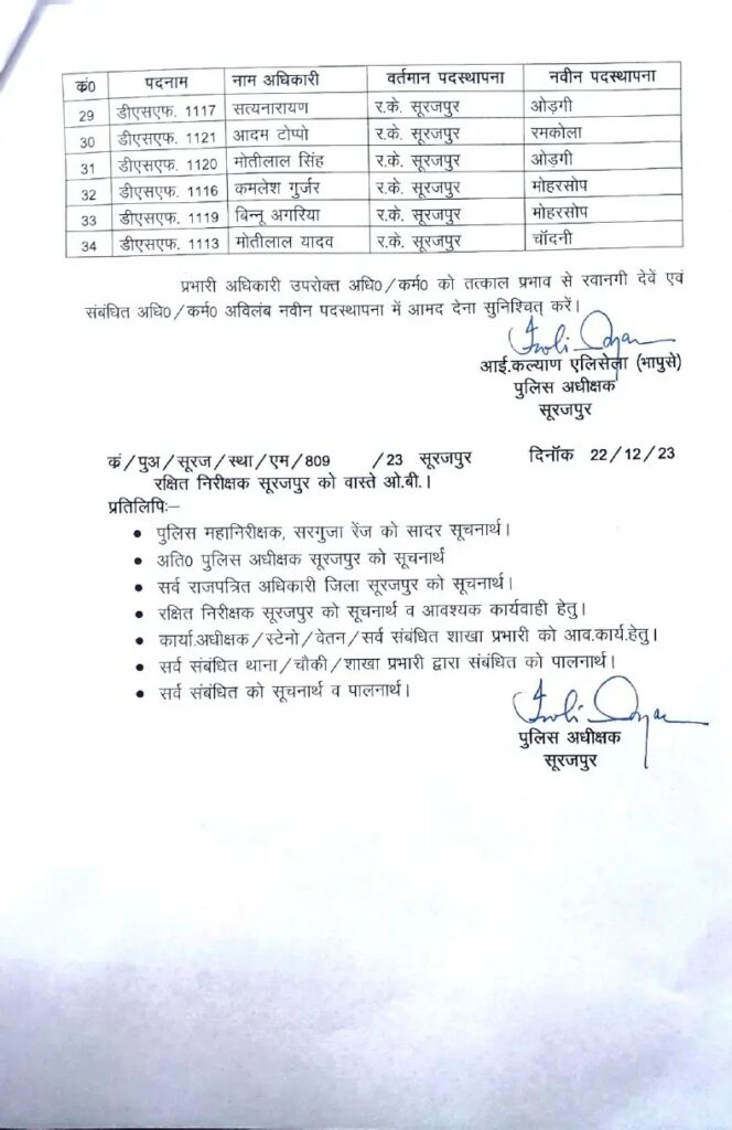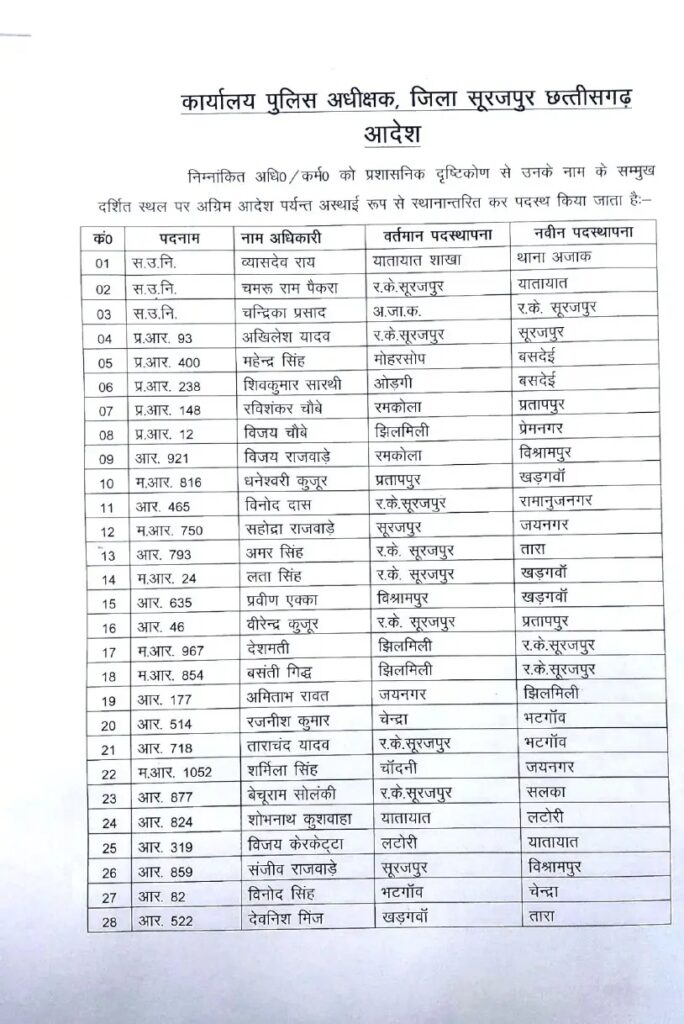 प्रदेश में विधानसभा चुनाव के बाद लगातार पुलिस विभाग में बड़ी सर्जरी जारी है। लगातार प्रदेश के अलग अलग जिलों से पुलिस विभाग ट्रांसफर का आदेश जारी हो रहा है। इसी बीच सूरजपुर पुलिस विभाग में बड़ी संख्या पुलिसकर्मियों का ट्रांसफर हुआ है। एक साथ 35 पुलिसकर्मियों का तबदला हुआ है। इस बाबत में सूरजपुर एसपी ने आदेश जारी किया है। देखे आदेश…