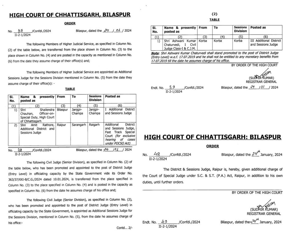 महासमुंद के जिला एवं सत्र न्यायाधीश भीष्म प्रसाद पांडेय को कोरिया ( बैकुंठपुर) का जिला एवं सत्र न्यायाधीश बना कर भेजा गया है। आनंद कुमार ध्रुव को कोरिया से कांकेर का जिला एवं सत्र न्यायाधीश बना कर भेजा गया है। अनीता डहरिया को जशपुर से महासमुंद का जिला एवं सत्र न्यायाधीश बना कर भेजा गया है। रायपुर के एक्ट्रोसिटी के स्पेशल जज हिरेंद्र सिंह टेकाम को जशपुर का जिला एवं सत्र न्यायाधीश बना कर भेजा गया है। छत्तीसगढ़ लोक सेवा आयोग के विधिक सलाहकार सत्येंद्र कुमार साहू को कोरबा का जिला एवं सत्र न्यायाधीश बना कर भेजा गया है।