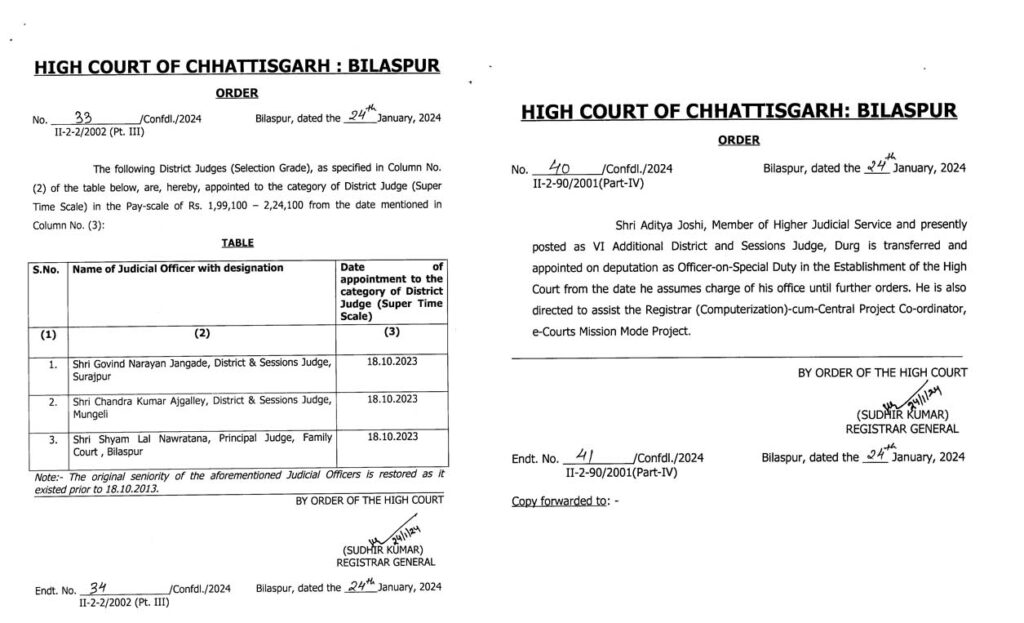 हाईकोर्ट ने पांच जिलों के जिला-सत्र न्यायधीशों समेत अपर जिला एवं सत्र न्यायधीशों, सिविल जजों के तबादला आदेश जारी किए हैं। जारी आदेश में तीन जिला एवं सत्र न्यायधीशों को सुपर टाइम स्केल भी दिया गया हैं। वही चार सिविल जजों को क्लास टू से क्लास वन में पदोन्नति देकर नई जगह पदस्थापना दी गई है। एक जिले में सिविल जज क्लास वन को प्रमोशन देकर सीजेएम बनाया गया है। वही रायपुर के जिला एवं सत्र न्यायधीश को एक्ट्रोसिटी कोर्ट का अतिरिक्त प्रभार सौंपा गया है।