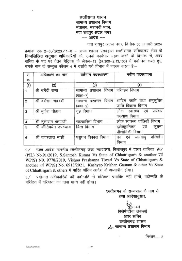 छत्तीसगढ़ सचिवालय सेवा के अनुभाग अधिकारियों को अवर सचिव के पद पर पदोन्नत, जारी हुआ आदेश