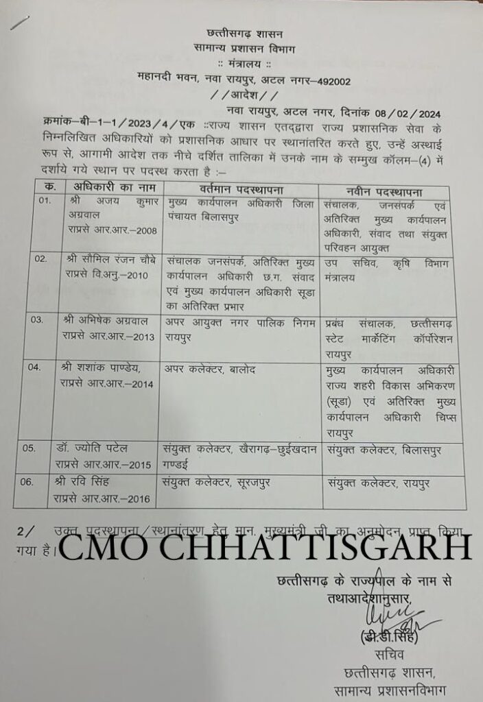 रायपुर । राज्य शासन ने राज्य प्रशासनिक सेवा के अधिकारियों की नवीन पदस्थापना का आदेश जारी किया है।देखें आदेश…