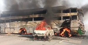 मथुरा। यूपी में मथुरा के मांट क्षेत्र में यमुना एक्सप्रेस वे पर सोमवार तड़के माइल स्टोन 117 अचानक से बस और एक कार में आग लग गई। सवारियों ने आनन फानन में बस से कूदकर अपनी जान बचाई। वहीं कार सवार 4 लोग जिंदा जल गए। सूचना मिलते ही पुलिस मौके पर पहुंच गई। आग बुझा दी गई है। मरने वालों की अभी शिनाख्त नहीं हो सकी है। दरअसल यमुना एक्सप्रेस-वे पर सोमवार सुबह आगरा की ओर से नोएडा जा रही प्राइवेट वॉल्वो बस का पहिया अचानक पंचर हो गया। इससे बस अनियंत्रित होकर सड़क पर तिरछी हो गई। इसी बीच पीछे से आ रही एक स्विफ्ट कार उसमे जा भिड़ी। टक्कर होते ही धमाका हुआ और भीषण आग लग गई। बस की सवारियों ने बस से कूदकर अपनी जान बचाई। बताया गया है कार सवार अंदर ही फंस गए। हादसे में स्विफ्ट कार सवार 4 लोग जिंदा जल गए। कार फिरोजाबाद जिले के शिकोहाबाद निवासी अंशुल यादव ड्राइव कर रहा था। एसएससी शैलेश कुमार पांडेय के अनुसार आग बुझा ली गई है। कार में 4 लोगों जिंदा जलकर मौत हो गई।