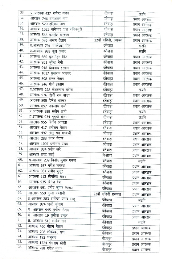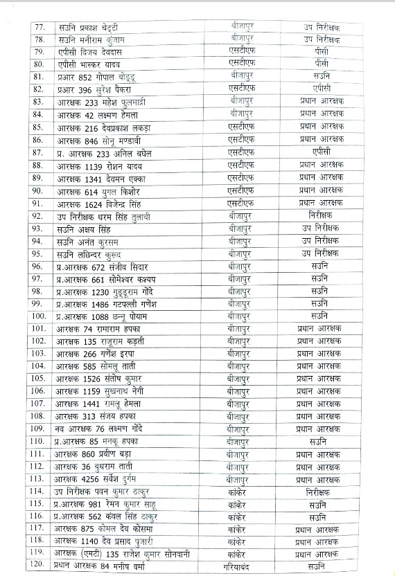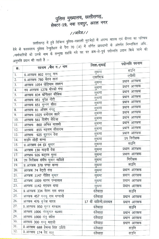 रायपुर । पुलिस-नक्सली मुठभेड़ में डटकर लड़ने वाले पुलिस अधिकारी और कर्मचारियों का प्रमोशन किया है। पुलिस मुख्यालय ने इस संबंध में इस संबंध में आदेश जारी कर दिया है। जारी लिस्ट में 131 अधिकारी-कर्मचारी शामिल हैं, जिसमें सहायक उप निरीक्षक, प्रधान आरक्षक, उप निरीक्षक, सहायक उप निरीक्षक, पीसी, एपीसी प्रमोट किए गए हैं।