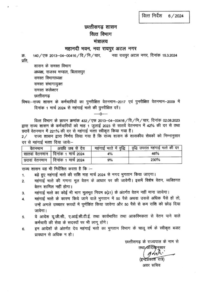 मुख्यमंत्री विष्णु देव साय ने अधिकारी-कर्मचारियों तथा मीडियाबंधुओं के हित में पांच अहम फैसले लिये। इनमें अधिकारी-कर्मचारियों को सातवें वेतनमान पर चार प्रतिशत का महंगाई भत्ता देना भी शामिल है। इसका लाभ पेंशनरों को भी मिलेगा। महंगाई भत्ते की यह राशि एक मार्च 2024 की तिथि से मिलेगी। राज्य के अधिकारी-कर्मचारियों को सातवें वेतनमान के एरियर्स की अंतिम किश्त की राशि का भुगतान भी होगा। इसके साथ ही मुख्यमंत्री ने प्रमुख सचिव, पंचायत एवं ग्रामीण विकास निहारिका बारिक की अध्यक्षता में एक समिति भी बनाई है जो कर्मचारियों की समस्याओं के संबंध में समीक्षा करेगी और इनके निराकरण से संबंधी सुझाव शासन को प्रस्तुत करेगी। ग्राम पंचायत सचिवों को भी राहत देते हुए उनके 55 दिनों की हड़ताल अवधि का वेतन भुगतान करने का निर्णय लिया गया है। अर्जित अवकाश में यह हड़ताल अवधि समायोजित होगी। इन निर्णयों से होली के त्यौहार में कर्मचारियों के परिवारों में खुशियों के और भी रंग भर जाएंगे। महंगाई भत्ते में वृद्धि की घोषणा करते हुए मुख्यमंत्री ने बताया कि राज्य के कर्मचारियों को सातवें वेतनमान में 04 प्रतिशत महंगाई भत्ते में एवं पेंशनरों के महंगाई राहत में 04 प्रतिशत की वृद्धि करने का निर्णय लिया है। यह महंगाई भत्ता एवं महंगाई राहत 1 मार्च 2024 से दिया जाएगा। इसके फलस्वरूप महंगाई भत्ते और महंगाई राहत की दर सातवें वेतनमान में 42 प्रतिशत से बढ़कर 46 प्रतिशत तथा छठवें वेतनमान में यह 230 प्रतिशत हो जाएगी। यानि छठवें वेतनमान में सीधे 9 प्रतिशत की बढ़ोतरी की गई है। इस निर्णय से राज्य के 3 लाख 90 हजार कर्मचारी तथा 1 लाख 20 हजार पेंशनर लाभान्वित होंगे। इस निर्णय से राज्य के कर्मचारियों और पेंशनरों को प्रतिमाह 68 करोड़ रुपए तथा साल में 816 करोड़ रुपए का लाभ प्राप्त होगा। मुख्यमंत्री ने इस अवसर पर अधिकारियों-कर्मचारियों की सातवें वेतनमान के एरियर्स की अंतिम किश्त प्रदान करने की घोषणा भी की। मुख्यमंत्री ने आज संवेदनशील निर्णय लेते हुए ग्राम पंचायत सचिवों को भी राहत दी। ग्राम पंचायत सचिव पिछले साल 16 मार्च 2023 से 9 मई 2023 तक कुल 55 दिन हड़ताल पर थे। मुख्यमंत्री ने बताया कि ग्राम पंचायत सचिवों की हड़ताल अवधि को उनके अर्जित अवकाश में समायोजित करते हुए उन्हें 55 दिनों का वेतन भुगतान किया जाएगा। इस निर्णय से राज्य शासन पर 70 करोड़ रुपए का व्यय-भार आएगा।मुख्यमंत्री ने कहा कि कर्मचारी भाईयों ने बहुत सी मांगों और समस्याओं के संबंध में अपनी बातें हमसे साझा की हैं। हम उनकी समस्याओं का पूरी संवेदनशीलता से समाधान करेंगे। उन्होंने बताया कि इन समस्याओं के हल के लिए प्रमुख सचिव, पंचायत एवं ग्रामीण विकास निहारिका बारीक की अध्यक्षता में पांच सदस्यी