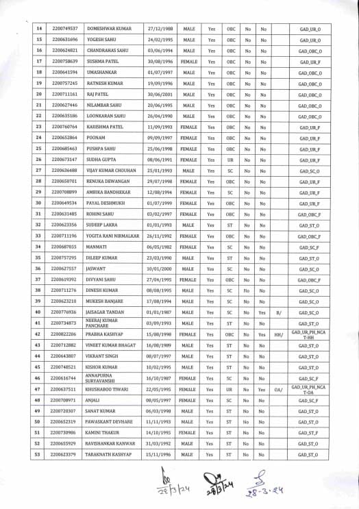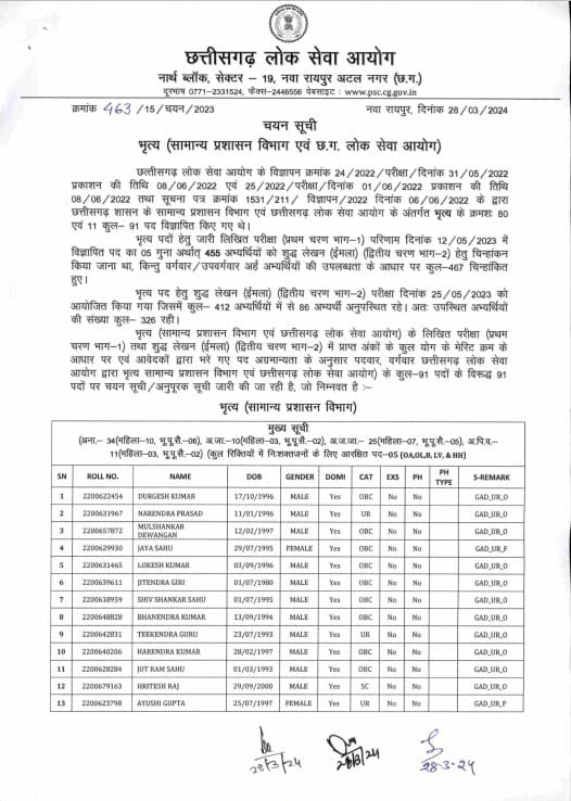 भृत्य (सामान्य प्रशासन विभाग एवं छत्तीसगढ़ लोक सेवा आयोग) के लिखित परीक्षा (प्रथम चरण भाग-1) तथा शुद्ध लेखन (इमला) (द्वितीय चरण भाग-2) में प्राप्त अंकों के कुल योग के मेरिट क्रम के आधार पर एवं आवेदकों द्वारा भरे गए पद अग्रमान्यता के अनुसार पदवार, वर्गवार छत्तीसगढ़ लोक सेवा आयोग द्वारा भृत्य सामान्य प्रशासन विभाग एवं छत्तीसगढ़ लोक सेवा आयोग) के कुल-91 पदों के विरूद्ध 91 पदों पर चयन सूची/अनुपूरक सूची जारी की जा रही है।