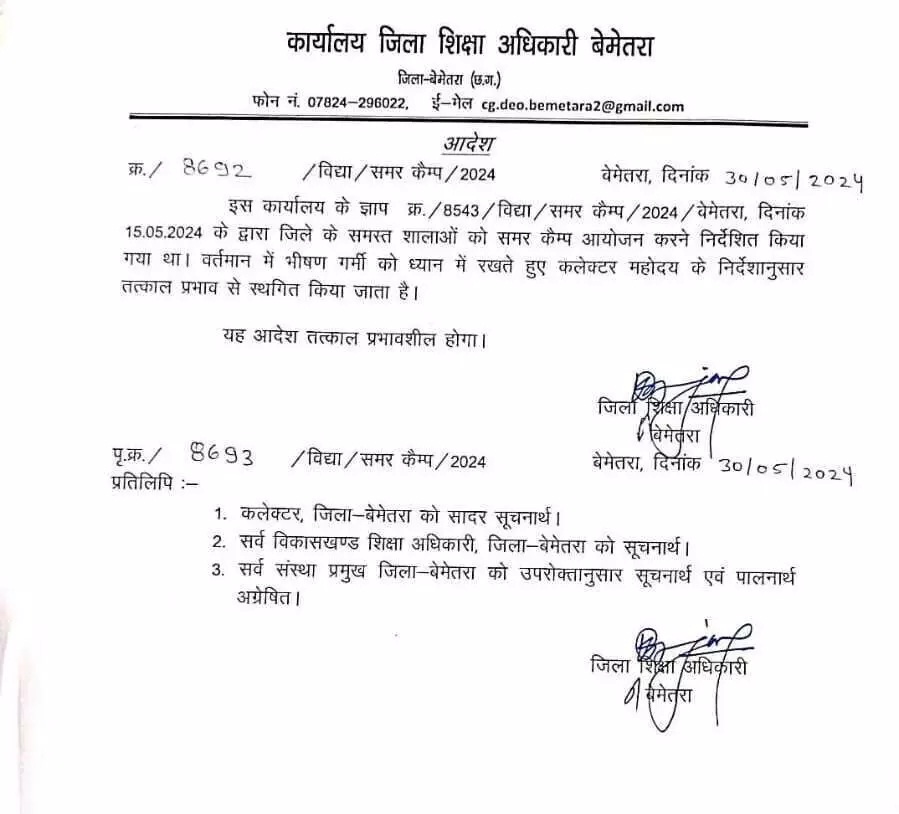 छत्तीसगढ़ मे इन दिनों भीषण गर्मी पड़ रही है। जिसका असर बच्चों में देखने को मिल रहा है। बढ़ती गर्मी से स्कूली बच्चे बीमार न हो और बच्चों को गर्मी से बचाने के लिए बेमेतरा कलेक्टर ने जिले के सभी स्कूलों में आयोजित समर कैम्प को स्थगित करने का आदेश जारी किया है। मालूम हो कि 15 मई से सभी कक्षाओं में समर कैम्प आयोजन करने के निर्देश दिये गये थे, जिसे भीषण गर्मी को देखते हुये तत्काल प्रभाव से स्थगित कर दिया गया है। देखें आदेश…