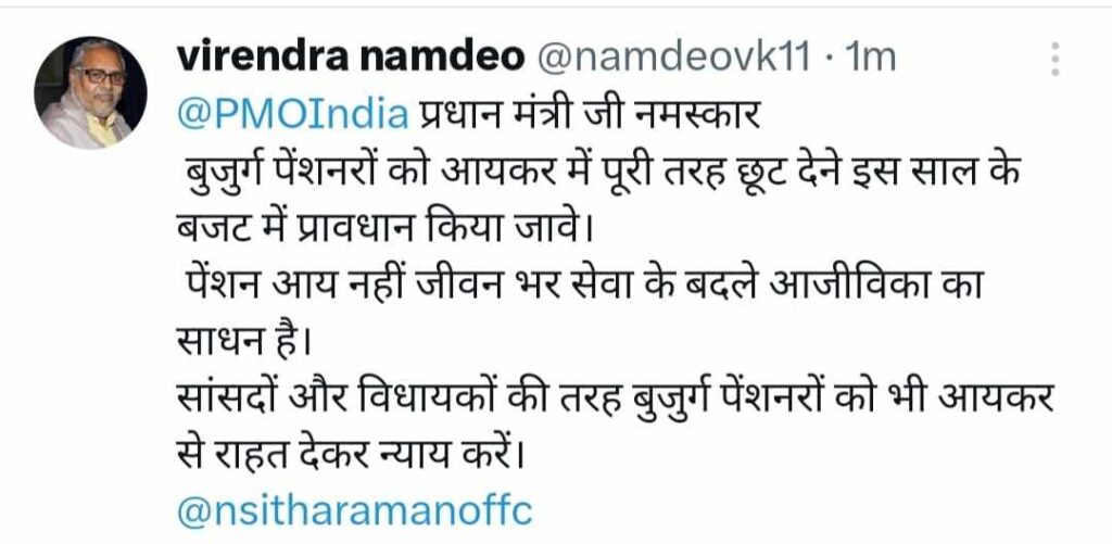 भारतीय राज्य पेंशनर्स महासंघ के राष्ट्रीय महामंत्री एवं छत्तीसगढ़ इकाई के प्रांताध्यक्ष वीरेन्द्र नामदेव ने प्रधानमंत्री नरेन्द्र मोदी और केंद्रीय वित्त मंत्री निर्मला सीतारमण को सोशल मीडिया एक्स पर संदेश पोस्ट कर आगामी केंद्रीय बजट में प्रावधान कर पेंशन की राशि को आयकर के दायरे से मुक्त करने की मांग की है। एक्स पोस्ट में उन्होंने कहा है कि जीवन के अंतिम छोर में आयकर के दायरे से हटाकर बुजुर्ग पेंशनरों के साथ केन्द्र सरकार को न्याय करना चाहिए। सेवानिवृत शासकीय सेवक मिलने वाली पेंशन की राशि आय नहीं है बल्कि पेंशन उनके जीवन भर के सेवा के बदले बुढ़ापे में आजीविका का साधन है। भारतीय राज्य पेंशनर्स महासंघ के राष्ट्रीय महामन्त्री एव्ं छत्तीसगढ़ राज्य संयुक्त पेंशनर फेडरेशन के प्रदेश अध्यक्ष वीरेन्द्र नामदेव ने बताया है कि देश में जिंदगी के अंतिम पड़ाव में जीवन यापन कर रहे बुजुर्ग पेंशनरों को हर साल आयकर रिटर्न फाइल करना अत्यन्त पीड़ादायक हो गया है। जो लोग अपने जिंदा होने के प्रमाण पत्र जमा करने के हालत में नहीं है उन्हे इंकमटैक्स के नाम पर मानसिक, शरीरिक और आर्थिक शोषण का शिकार बनना पड़ता है, यह अन्याय पूर्ण है।
