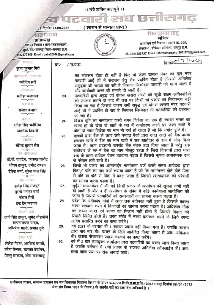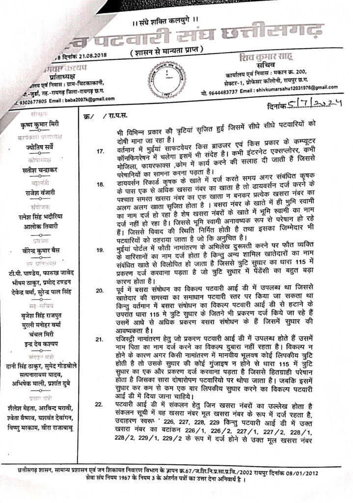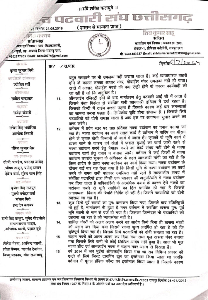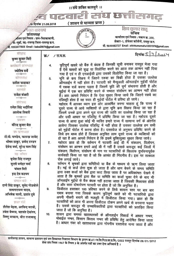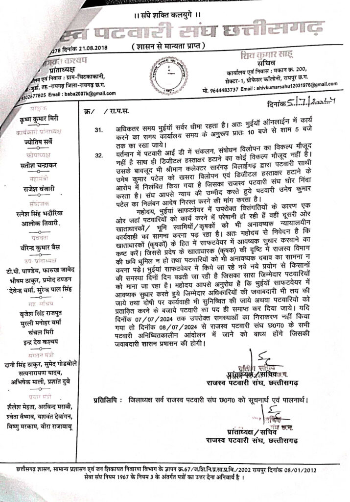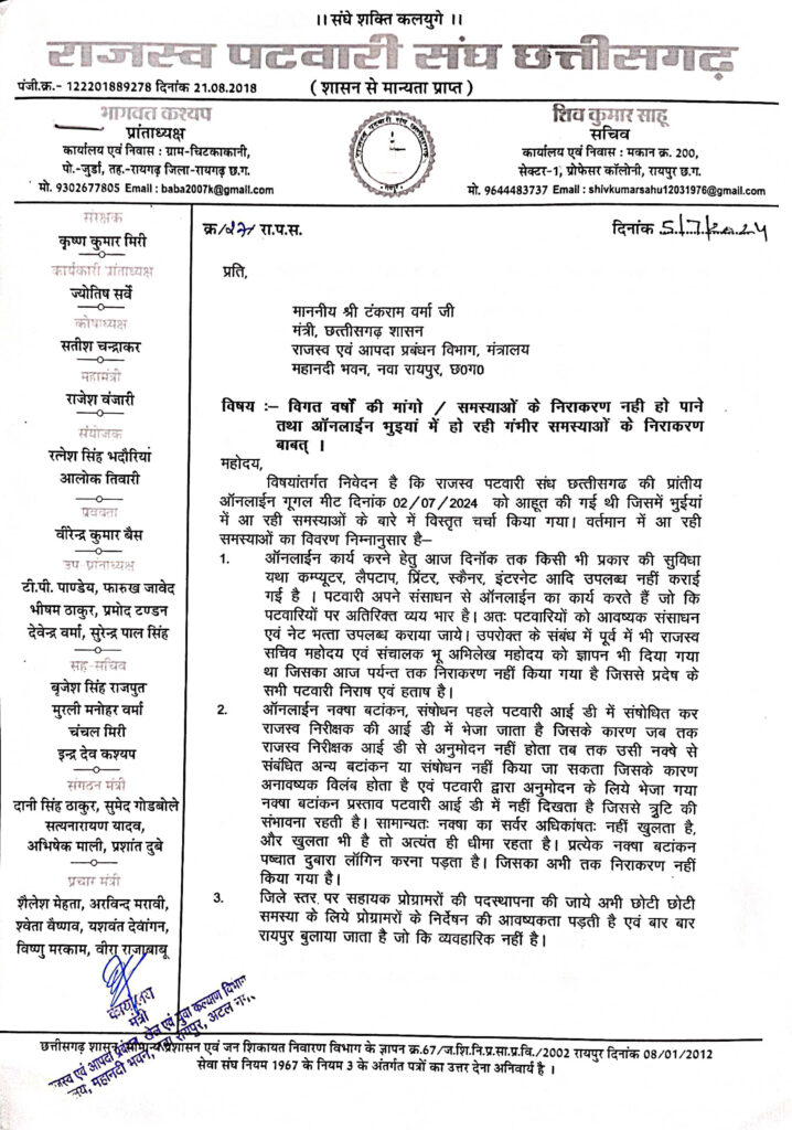 रायपुर। राजस्व पटवारी संघ ने विगत वर्षों की मांगों/समस्याओं के निराकरण नहीं हो पाने एवं ऑनलाइन भुंइया में हो रही गंभीर समस्याओं के निराकरण की मांग को लेकर राजस्व मंत्री टंकराम वर्मा को ज्ञापन प्रेषित किया है। संघ के प्रांताध्यक्ष भागवत कश्यप एवं सचिव शिव कुमार साहू ने जारी प्रेस विज्ञप्ति में बताया कि राजस्व पटवारी संघ छत्तीसगढ़ की प्रांतीय आनलाइन गूगल मीट विगत 2 जुलाई को आहूत की गई थी। जिसमें भुंइया में आ रही समस्याओं के बारे में विस्तृत चर्चा की गई।
