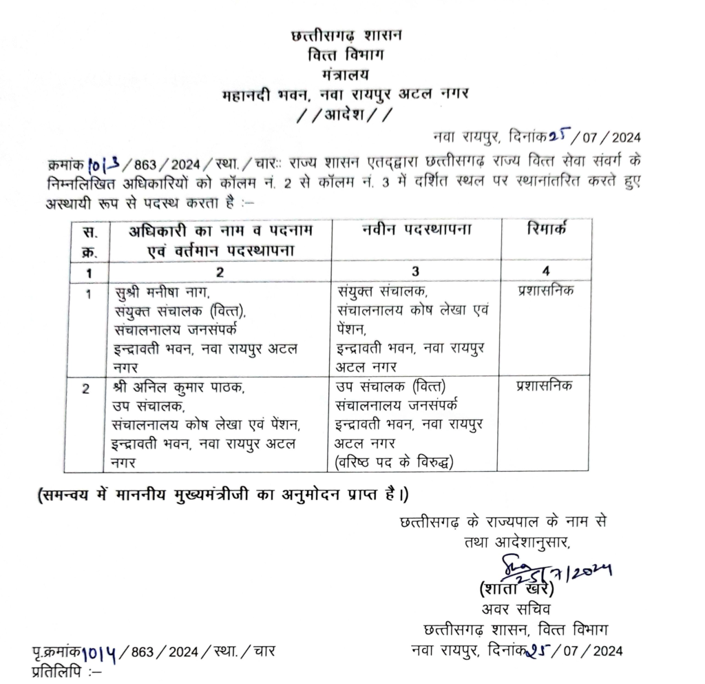 Share Facebook Copy Link Telegram WhatsApp रायपुर । राज्य शासन ने वित्त सेवा संवर्ग के 2 अधिकारियों का तबादला किया है।देखें आदेश… Advertisement Carousel ×
