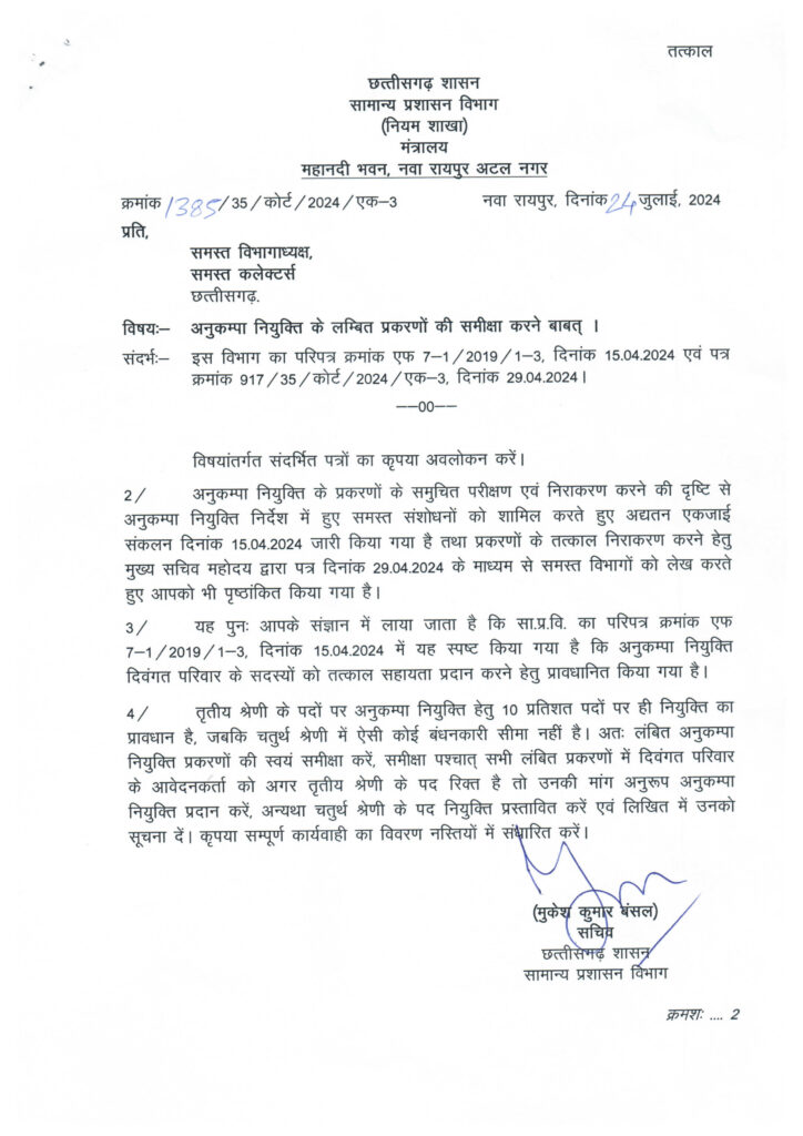 अनुकंपा नियुक्ति के लंबित प्रकरणों की समीक्षा करने संबंधी आदेश जारी…