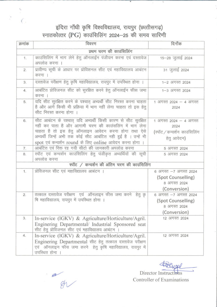 इंदिरा गांधी कृषि विश्वविद्यालय में स्नातकोत्तर पाठ्यक्रमों में प्रवेश हेतु काउंसलिंग प्रारंभ