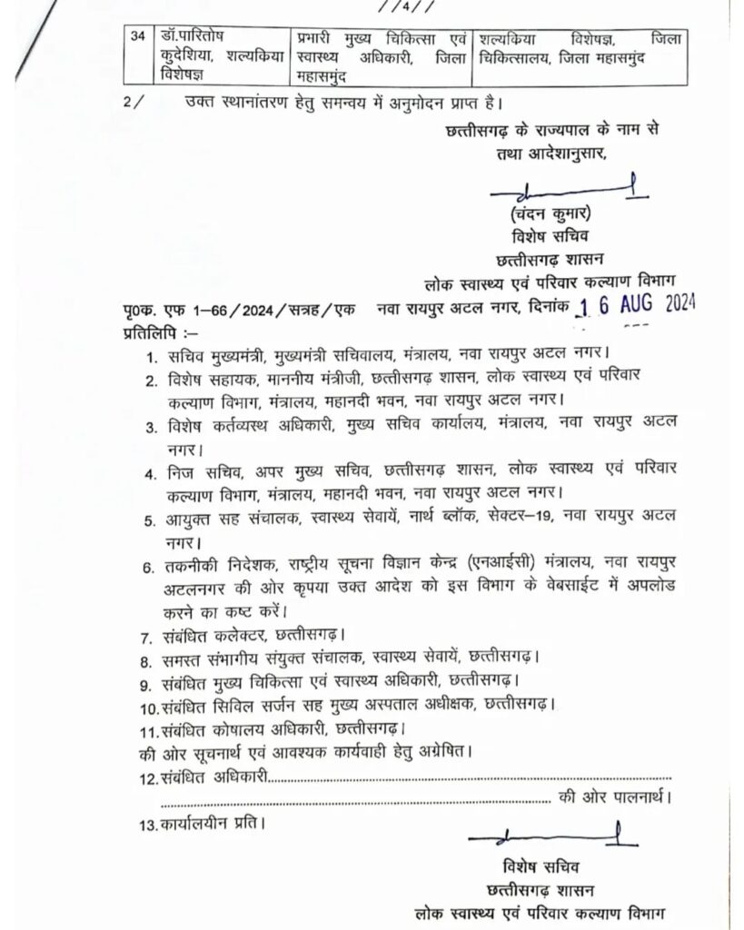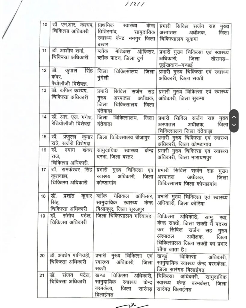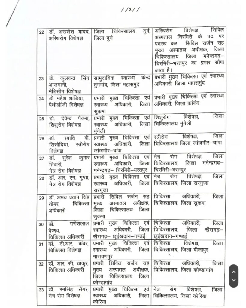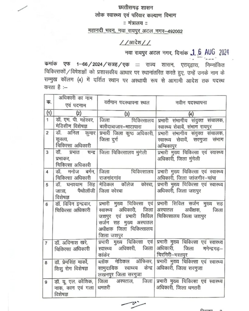 चिकित्सकों / विशेषज्ञों के प्रशासनिक आधार पर नई पदस्थापना के आदेश जारी
