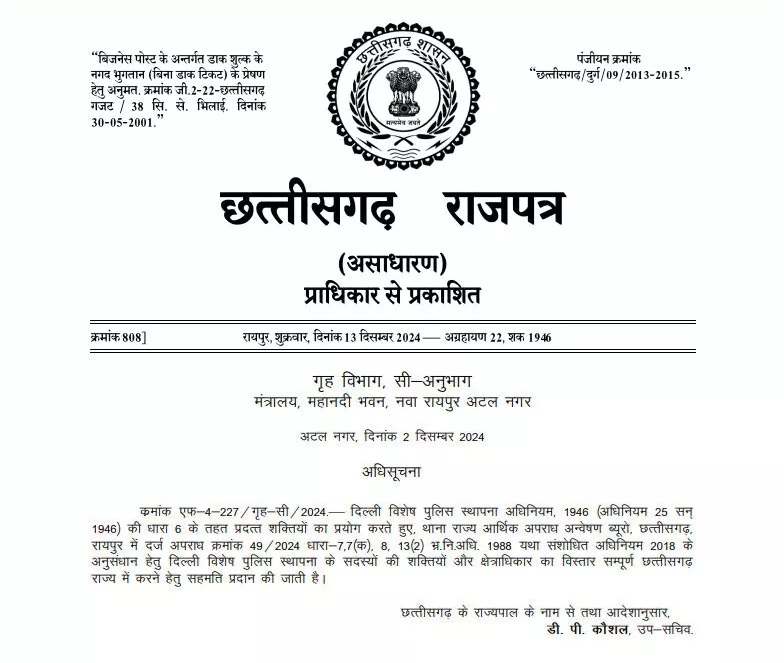 रायपुर । भ्रष्टाचार से जुड़ा एक और मामला राज्य सरकार ने सीबीआई को सौंप दिया है। इस संबंध में सरकार की तरफ से नोटिफिकेशन जारी कर दिया गया है। राज्य सरकार ने ईओडब्ल्यू एसीबी में दर्ज एफआईआर क्रमांक 49- 2024 को सीबीआई को सौंप दिया है। इसकी जांच के लिए राज्य सरकार ने सीबीआई को सहमति जारी कर दी है।