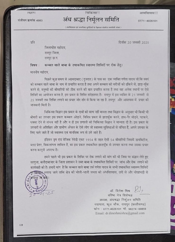 उन्होंने कहा कि हमने पहले भी इस प्रकार के शिविर पर रोक लगाने की मांग की थी, जिस पर संज्ञान लेते हुए सरगुजा, बलौदाबाजार के जिला प्रशासन ने उक्त बाबा के तथाकथित शिविरों पर जांच और रोक लगाने की कार्यवाही की है. हमारी मांग है कि कम्बल वाले बाबा उर्फ गणेश यादव के सभी तथाकथित स्वास्थ्य शिविरों पर प्रतिबंध लगाया जाये, ताकि क्षेत्र की भोली-भाली जनता को अंधविश्वास, ठगी से और धोखाधड़ी से बचाया जा सके.