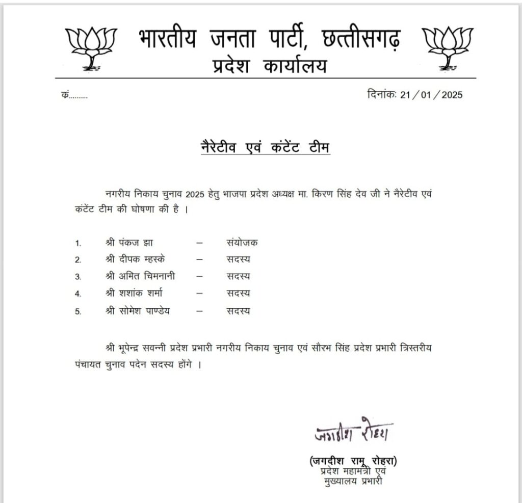 भारतीय जनता पार्टी के प्रदेश अध्यक्ष किरण देव ने आगामी नगरीय निकाय चुनाव-2025 के परिप्रेक्ष्य में मंगलवार को पार्टी की नैरेटिव एवं कंटेंट टीम की घोषणा की है। भाजपा प्रदेश महामंत्री जगदीश (रामू) रोहरा ने यह जानकारी देते हुए बताया कि मुख्यमंत्री के मीडिया सलाहकार पंकज झा इस टीम के संयोजक बनाए गए हैं। टीम में प्रदेश प्रवक्ता दीपक म्हस्के, प्रदेश मीडिया प्रभारी अमित चिमनानी, शशांक शर्मा, सोमेश पाण्डेय सदस्य होंगे। नगरीय निकाय चुनाव प्रभारी भूपेंद्र सिंह सवन्नी एवं त्रि-स्तरीय पंचायत चुनाव प्रभारी सौरभ सिंह टीम के पदेन सदस्य होंगे।