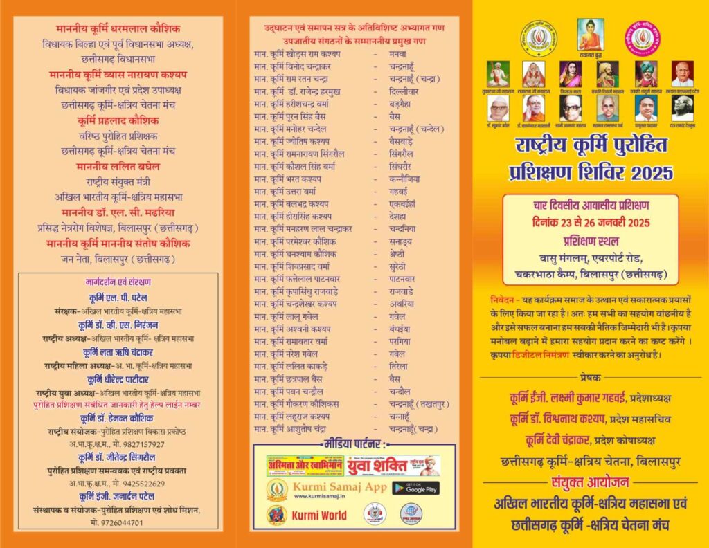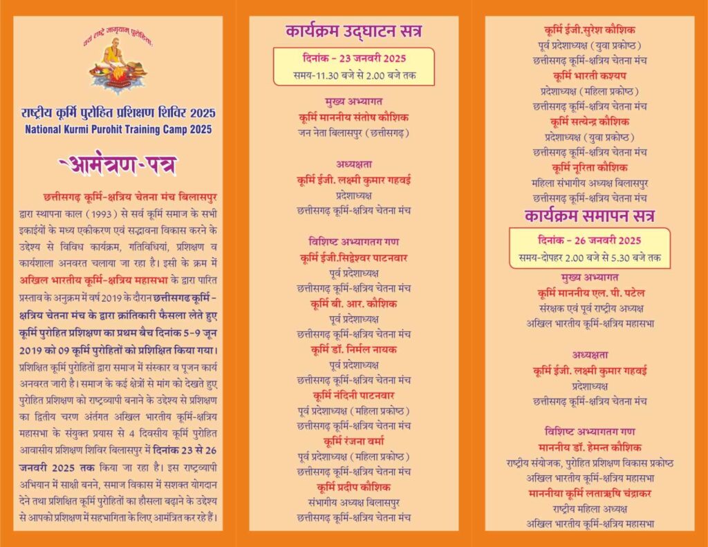 रायपुर। अखिल भारतीय कूर्मि क्षत्रिय महासभा एवं छत्तीसगढ़ कूर्मि क्षत्रिय चेतना मंच द्वारा दिनांक 23 जनवरी से 26 जनवरी तक चार दिवसीय आवासीय प्रशिक्षण का आयोजन वासु मंगलम एयरपोर्ट रोड, चकरभाठा कैम्प बिलासपुर में किया गया है। इस प्रशिक्षण शिविर को राष्ट्रीय कूर्मि पुरोहित प्रशिक्षण शिविर का नाम दिया गया है। इस राष्ट्रीय कूर्मि पुरोहित प्रशिक्षण शिविर को अखिल भारतीय कूर्मि क्षत्रिय महासभा के प्रदेश अध्यक्ष चंद्रभूषण वर्मा ने प्रदेश के सामाजिक लोगों से ऐसे फर्जी कार्यक्रमों से दूर रहने का आग्रह किया है। महासभा के प्रदेश अध्यक्ष श्री वर्मा ने बताया कि इस प्रशिक्षण शिविर में अखिल भारतीय कूर्मि क्षत्रिय महासभा के नाम पर जिन पदाधिकारियों को अतिथि के तौर पर आमंत्रित किया गया है वे फर्जी एवं असंसैधानिक रूप से पदस्थ है। अखिल भारतीय कूर्मि क्षत्रिय महासभा के प्रदेश अध्यक्ष चंद्रभूषण वर्मा ने कहा कि ऐसी गतिविधियों को बर्दाश्त नहीं किया जाएगा। उनका कहना है कि समाज संगठित होकर हर क्षेत्र में आगे बढ़ रहा है। ऐसे में राजनीतिक स्वार्थपूर्ति के लिए कुछ लोगों द्वारा महासभा के पंजीयन का दुरुपयोग करते हुए फर्जी पदाधिकारियों को मंचासीन किया जा रहा है। ऐसे लोगों और संरक्षण देने वालों के खिलाफ सख्त कार्रवाई किए जाने की मांग पुलिस प्रशासन से की है।