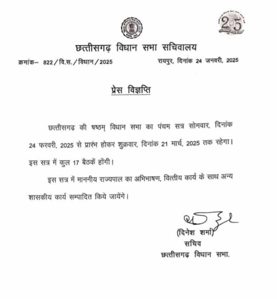 छत्तीसगढ़ विधानसभा के बजट सत्र की अधिसूचना जारी कर दी गई है। सत्र की बैठक 24 फरवरी से शुरू होगी और 21 मार्च तक चलेगी। इस दौरान सदन की 17 बैठक होगी।