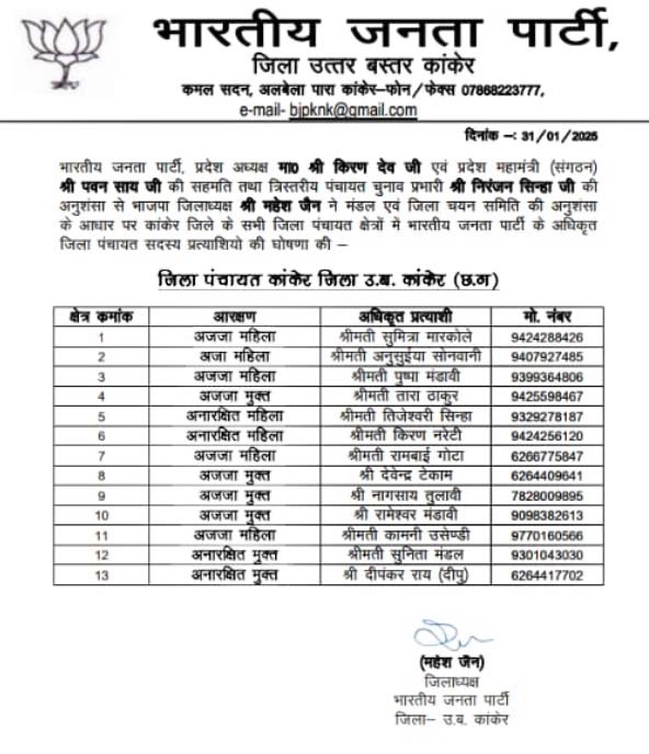 कांकेर । नगरीय निकायों के अलावा त्रिस्तरीय पंचायत चुनावों को भी भाजपा काफी गंभीरता से ले रही है। इस बात की बानगी देखने को मिली है कांकेर जिले में। यहां भाजपा ने अपनी एक पूर्व विधायक को भी जिला पंचायत सदस्य पद के लिए पार्टी की ओर से अधिकृत उम्मीदवार घोषित किया है।