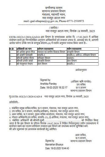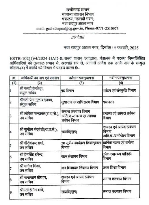 रायपुर। सामान्य प्रशासन विभाग ने मंत्रालय कैडर के दो संयुक्त सचिव के अलावा 7 उपसचिवों के विभाग बदल दिए हैं. इनमें 2 राज्य प्रशासनिक सेवा के हैं. वहीं मंत्रालय में पदस्थ अवर सचिव और अनुभाग अधिकारियों को नई पोस्टिंग दी है. इनमें से अधिकांश हाल ही में पदोन्नत अवर सचिवों को प्रभार देने के साथ दोहरे प्रभार वाले पुराने अवर सचिव को एक-एक विभाग से मुक्त किया गया है.
