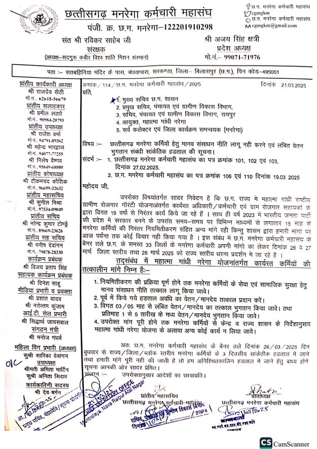 रायपुर। छत्तीसगढ़ में ग्रामीण विकास की सफलता के पीछे मनरेगा कर्मचारियों का अहम योगदान रहा है, लेकिन आज वही कर्मचारी अपने भविष्य को लेकर चिंतित हैं। 19 साल से राज्य की प्रगति में योगदान देने के बावजूद न तो उनकी सेवा सुरक्षा सुनिश्चित हो पाई है और न ही उन्हें स्थायी नौकरी का दर्जा मिला।अब उम्र के पांचवें दशक में कदम रख चुके हजारों मनरेगा कर्मी अपने भविष्य की सुरक्षा के लिए संघर्ष कर रहे हैं। इसी कड़ी में 28 मार्च को प्रदेश भर के 12 हजार कर्मचारी रायपुर में एकत्रित होकर मुख्यमंत्री विष्णुदेव साय और उपमुख्यमंत्री एवं पंचायत मंत्री विजय शर्मा के नाम कलेक्टर को ज्ञापन सौंपेंगे।रदेशभर के मनरेगा कर्मचारी लंबे समय से सेवा स्थायीकरण और वेतन संबंधी समस्याओं को लेकर आवाज उठा रहे हैं। पिछले पांच महीनों से वेतन नहीं मिलने के कारण कर्मचारी आर्थिक तंगी से जूझ रहे हैं। बच्चों की स्कूल फीस, बुजुर्ग माता-पिता की दवाइयां, घर का किराया और रोजमर्रा की जरूरतें पूरी करना भी मुश्किल हो गया है।सरकार द्वारा गठित कमेटी को 15 दिन में रिपोर्ट सौंपनी थी, लेकिन महीनों बीत जाने के बाद भी कोई ठोस निर्णय नहीं लिया गया। उल्टा, कर्मचारियों पर मनरेगा के अलावा पीएम आवास, स्वच्छ भारत मिशन (SBM) और अन्य विभागीय कार्यों का बोझ बढ़ता जा रहा है। ऐसे में सवाल उठता है कि प्रशासन इन कर्मचारियों के प्रति इतना असंवेदनशील क्यों बना हुआ है?