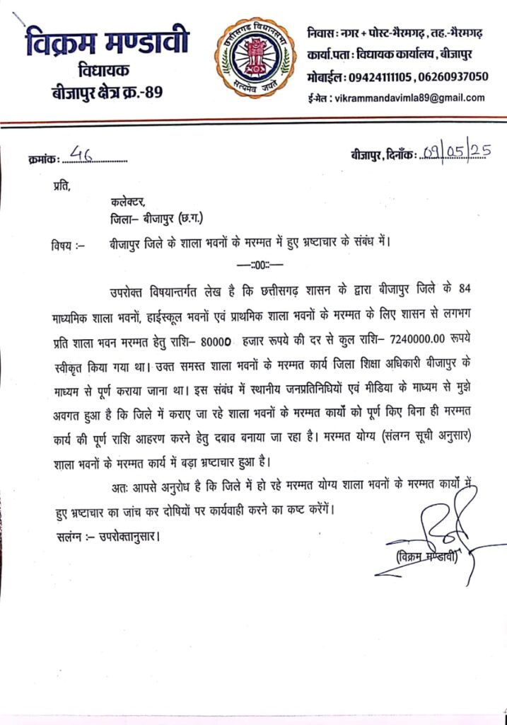 विधायक मंडावी ने पत्र में बताया कि छत्तीसगढ़ सरकार ने बीजापुर जिले के 84 प्राथमिक, माध्यमिक और उच्चतर माध्यमिक स्कूल भवनों की मरम्मत के लिए प्रति भवन ₹80,000 की दर से कुल ₹72.40 लाख की राशि स्वीकृत की थी। यह कार्य जिला शिक्षा अधिकारी के माध्यम से कराया जाना था।