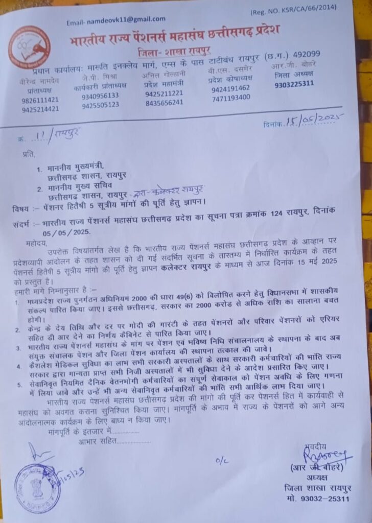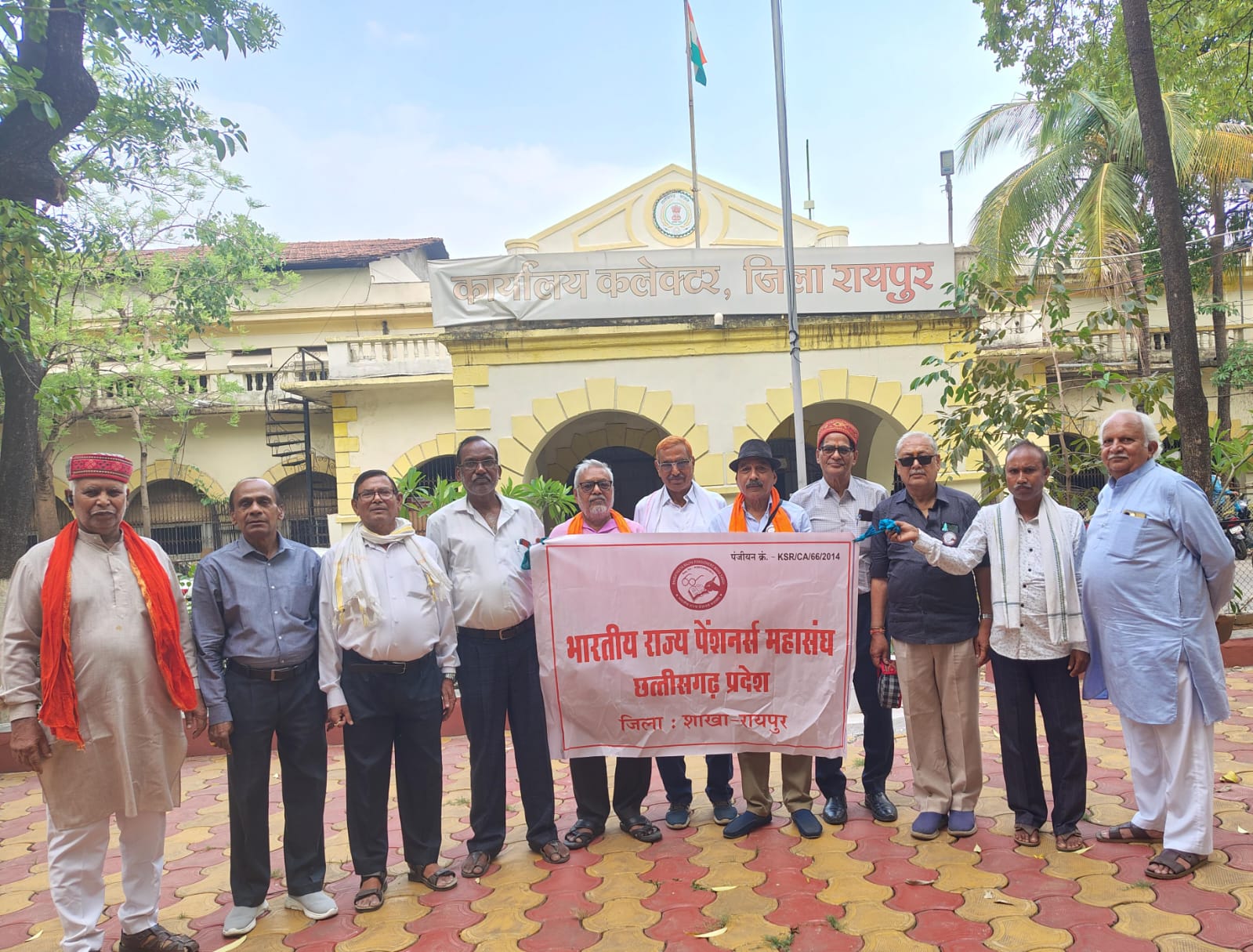 भारतीय राज्य पेंशनर्स महासंघ छत्तीसगढ़ प्रदेश के आव्हान पर रायपुर में कलेक्टर कक्ष के समक्ष पेंशनरों का एकत्रीकरण के बाद 5 सूत्रीय मांगो का ज्ञापन मुख्यमंत्री और मुख्यसचिव के नाम गौरव कुमार सिंह कलेक्टर रायपुर की अनुपस्थिति अपर कलेक्टर देवेन्द्र पटेल को रायपुर जिला के अध्यक्ष आर जी बोहरे के नेतृत्व में सौंपा गया। इस अवसर पर प्रतिनिधि मंडल में प्रांताध्यक्ष वीरेन्द्र नामदेव,प्रदेश महामंत्री अनिल गोलहानी, प्रदेश कोषाध्यक्ष बी एस दसमेर, सेवानिवृत दैनिक वेतन भोगी प्रकोष्ठ प्रदेश संयोजक अनिल पाठक , ओ डी शर्मा, राजेन्द्र कुमार पाण्डे,नागेन्द्र सिंह,गुलाब राव पवार तथा भीमराव जाम्हले आदि शामिल रहे।
