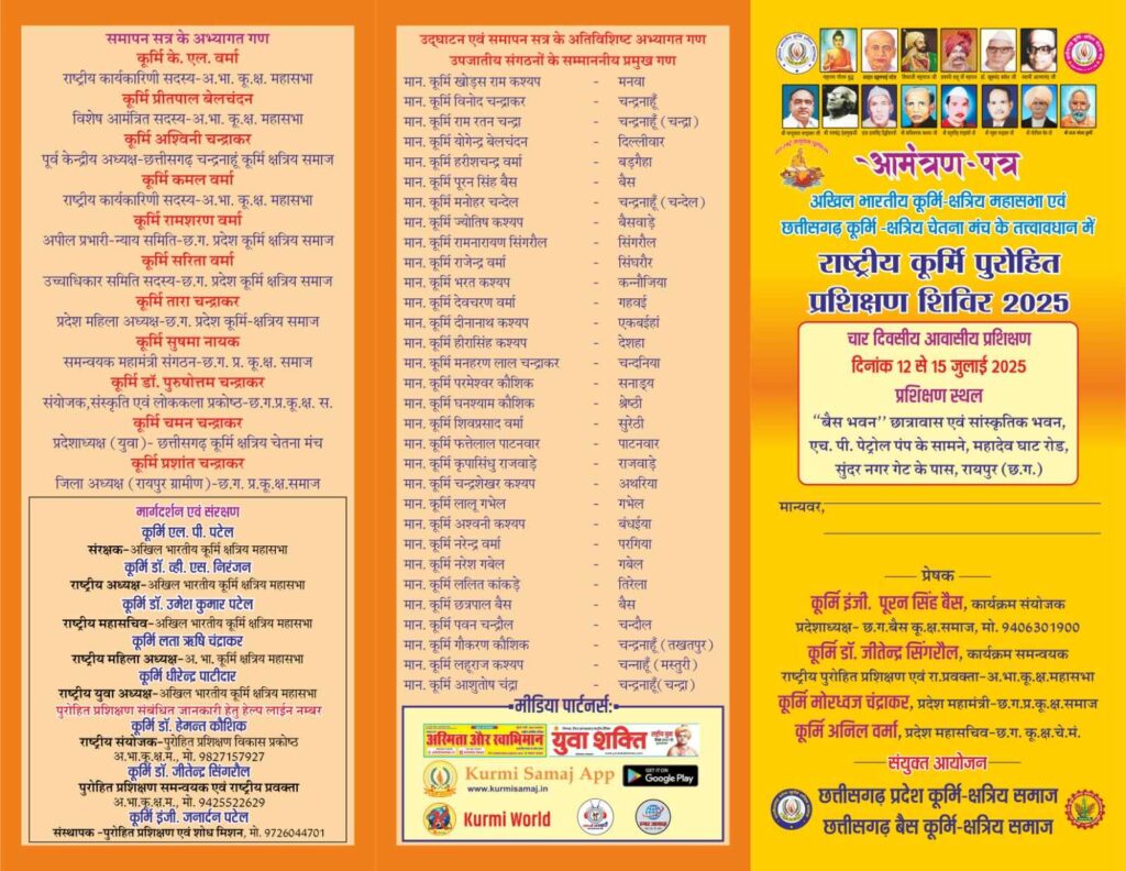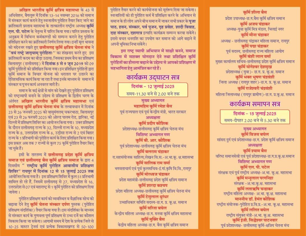 विजय बघेल द्वारा 12 से 15 जुलाई तक बैस भवन छात्रावास एवं सांस्कृतिक भवन सुंदर नगर रायपुर में राष्ट्रीय कूर्मि पुरोहित प्रशिक्षण शिविर का आयोजन किया जा रहा है। इस प्रशिक्षण शिविर में भी अखिल भारतीय कुर्मी क्षत्रिय महासभा का नाम उपयोग किया गया। जिसकी जानकारी वर्तमान प्रदेशाध्यक्ष चंदू वर्मा को हुई। जानकारी प्राप्त होने पर श्री वर्मा ने तत्काल प्रभाव से कूर्मि समाज के सभी लोगों को असलियत से अवगत कराया जा रहा है। फर्जी संगठन की आड़ लेकर विजय बघेल केन्द्र एवं राज्य सरकार में अपना वर्चस्व बताने का प्रयास कर रहे है, चंदा उगाही कर इस कार्यक्रम को सफल बनाने की भरपूर कोशिश की जा रही है। इस कूर्मि प्रशिक्षण शिविर में श्रीमती लताऋषि चंद्राकर जो राष्ट्रीय महिला अध्यक्ष है (फर्जी संगठन)। जितेन्द्र सिंगरौल, एल.पी.पटेल, डॉ. हेमंत कौशिक, ललित बघेल, कमल वर्मा, मन्नूलाल परगनिहा, धीरज पाटीदार इस संगठन में फर्जी पदाधिकारी की भूमिका निभा रहें हैं।