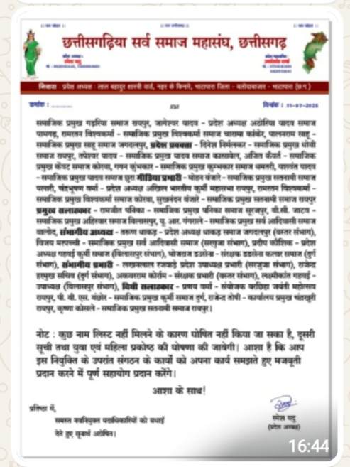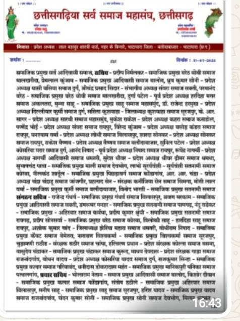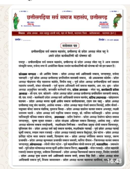 Share Facebook Copy Link Telegram WhatsApp रायपुर। छत्तीसगढिय़ा सर्व समाज महासंघ की प्रदेश कार्यकारिणी की घोषणा कर दी गई। राजधानी रायपुर के राजेन्द्र नगर स्थित सतनाम सांस्कृतिक भवन में आयोजित बैठक में महासंघ के प्रदेश अध्यक्ष रमेश यदु ने प्रदेश स्तरीय कार्यकारिणी घोषणा की जो इस प्रकार है- Advertisement Carousel ×